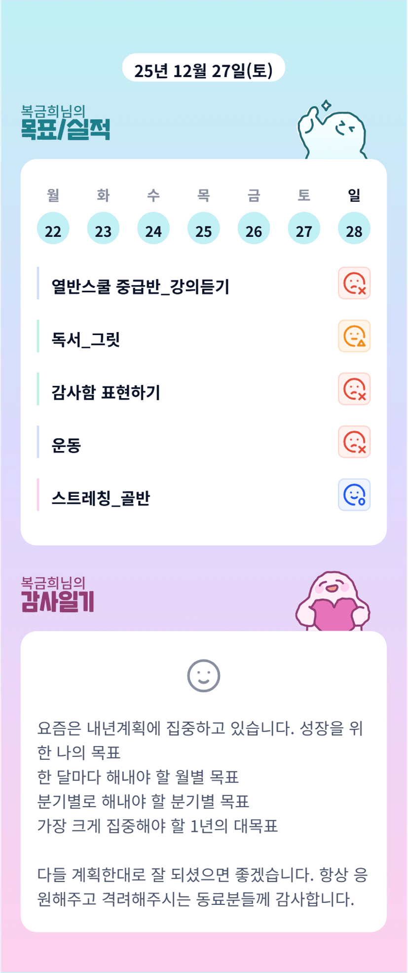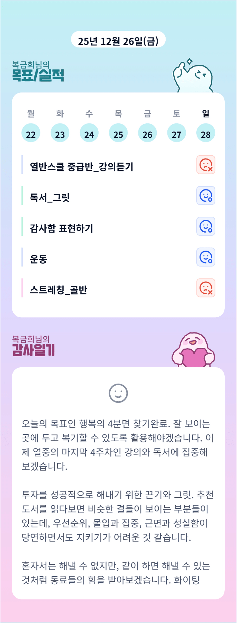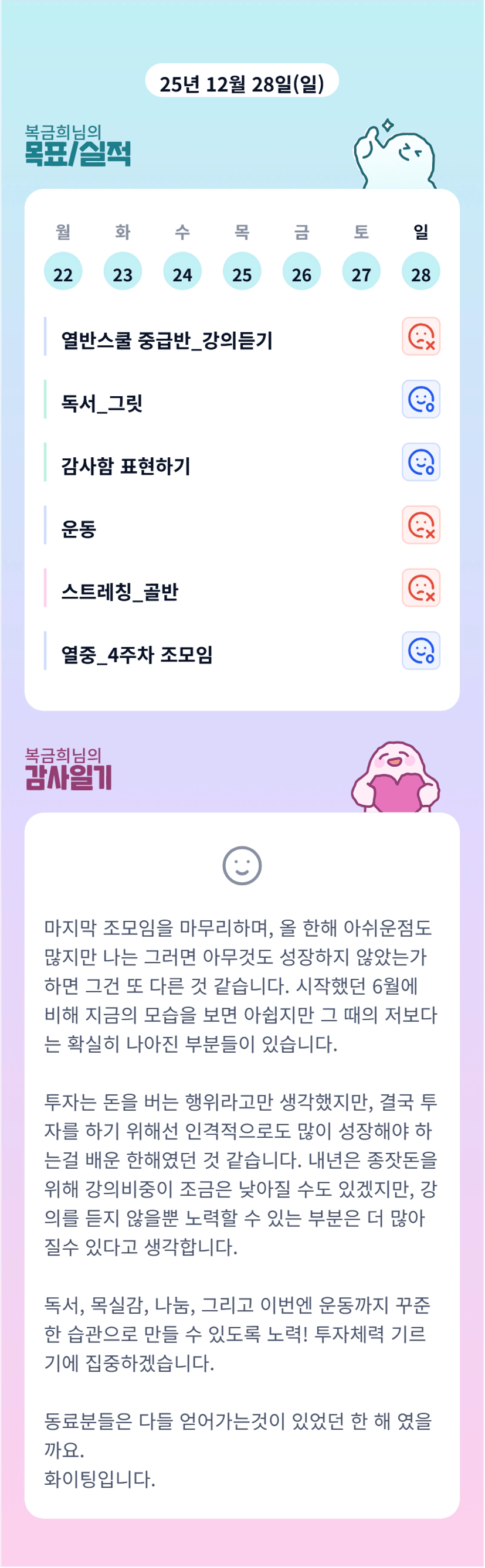오늘도 고생 많으셨어요 복금희님!!항상 많은 주제들 만들어주셔서 독모하기 너무 즐겁고 좋았어요! 복금희님은 아쉬운 한해였다고 하시지만 제가 볼 땐 너무 훌륭한 한해를 보내신 것 같습니다! 26년도 빠이팅입니다! 제가 금희님 운동 하나만큼은 매의 눈으로 26년에 관리들어가겠습니다 ㅎㅎㅎㅎㅎ잘 하시는지 지켜볼게요!!!