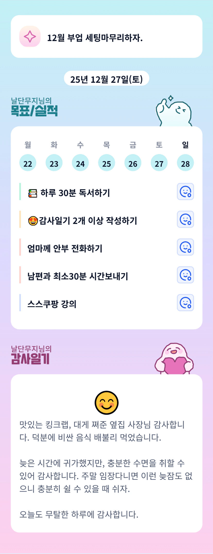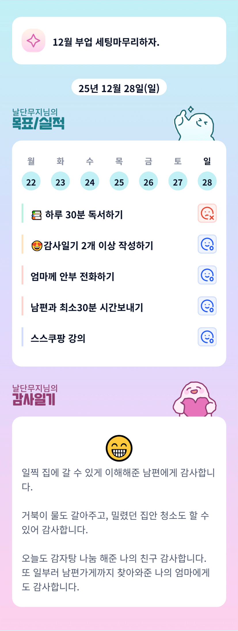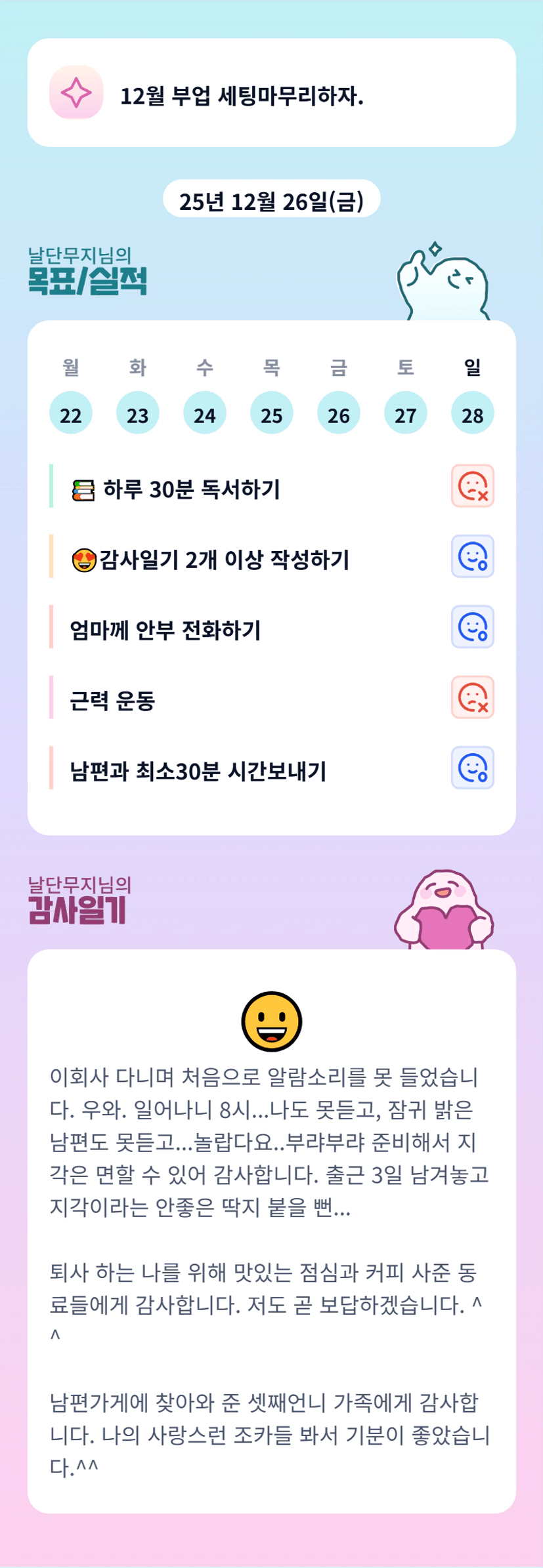 꾸준함이 중요하다. 부정적인 생각이 몰아닥칠 때 독서와 운동을 한다.