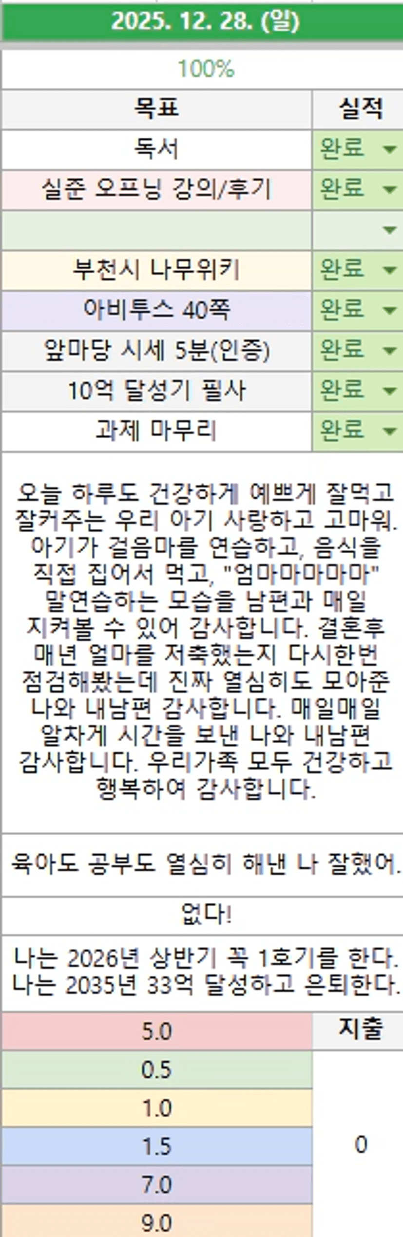 #자기암시나는 항상 투자를 생각하고 실천하는 실전투자자이다나는 시간을 소중히 여기고 과정을 즐기며 목표를 달성한다나는 작은 것에도 감사한다나는 매 순간 실력을 쌓는데 집중하고 성장하여 시장에서 살아남는 투자자가 된다내가 꿈꾸는 삶으로 만들기 위해 오늘도 열심히 노력한다나는 할 수 있다.