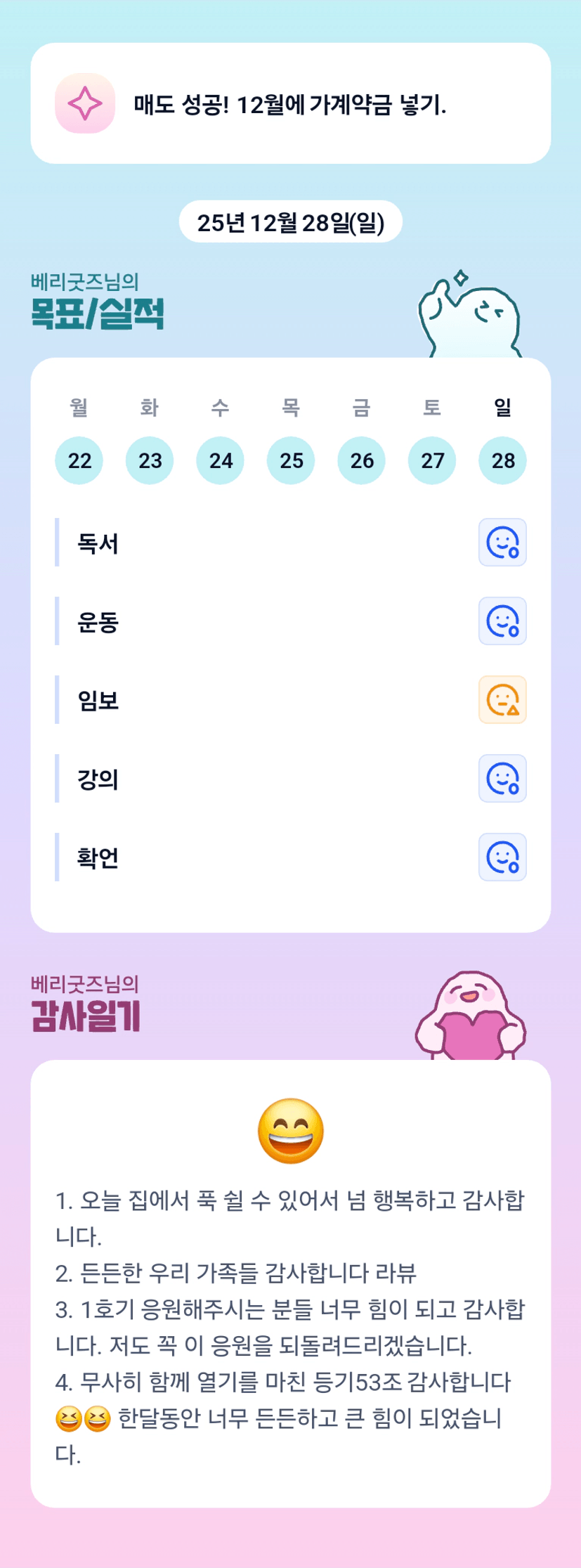 1호기 응원합니다. 그리고 저도 감사해요 굿즈님 덕분에 한 걸음 더 나아갈 수 있었습니다.
