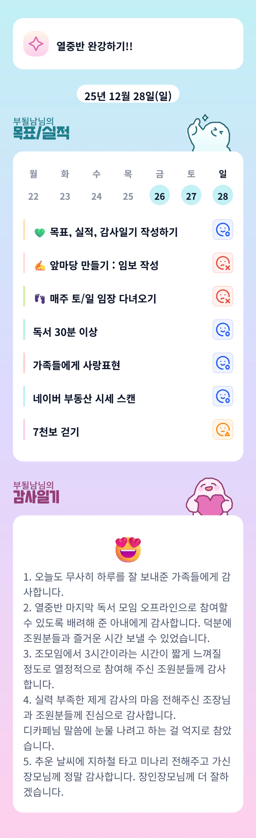 부될남님 디카페님 말씀처럼 정말 충분히 잘 하고 계신 것 같습니다. 지금 상황에서도 월부한다는게 정말정말 대단하시고 상위 1% 가장이라고 생각해요 ㅎㅎ 제가 감히 바쁜 정도를 알 수 없겠지만, 포기하지않고 꾸준히 독강임투하시면 좋은 결실 맺으실 수 있을거에요 화이팅입니다!!