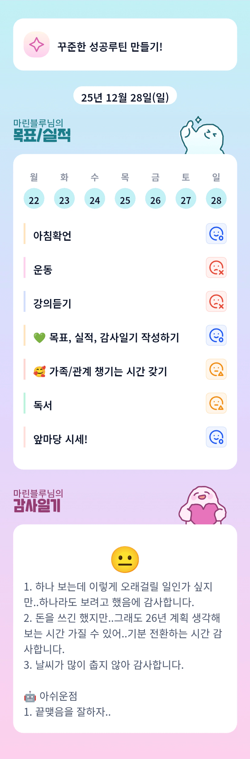 고고고 마린님! 이번주가 올해의 마지막이네요 벌써! 한 주 시작 잘하시고 한 해 마무리도 잘해보자구요 👍