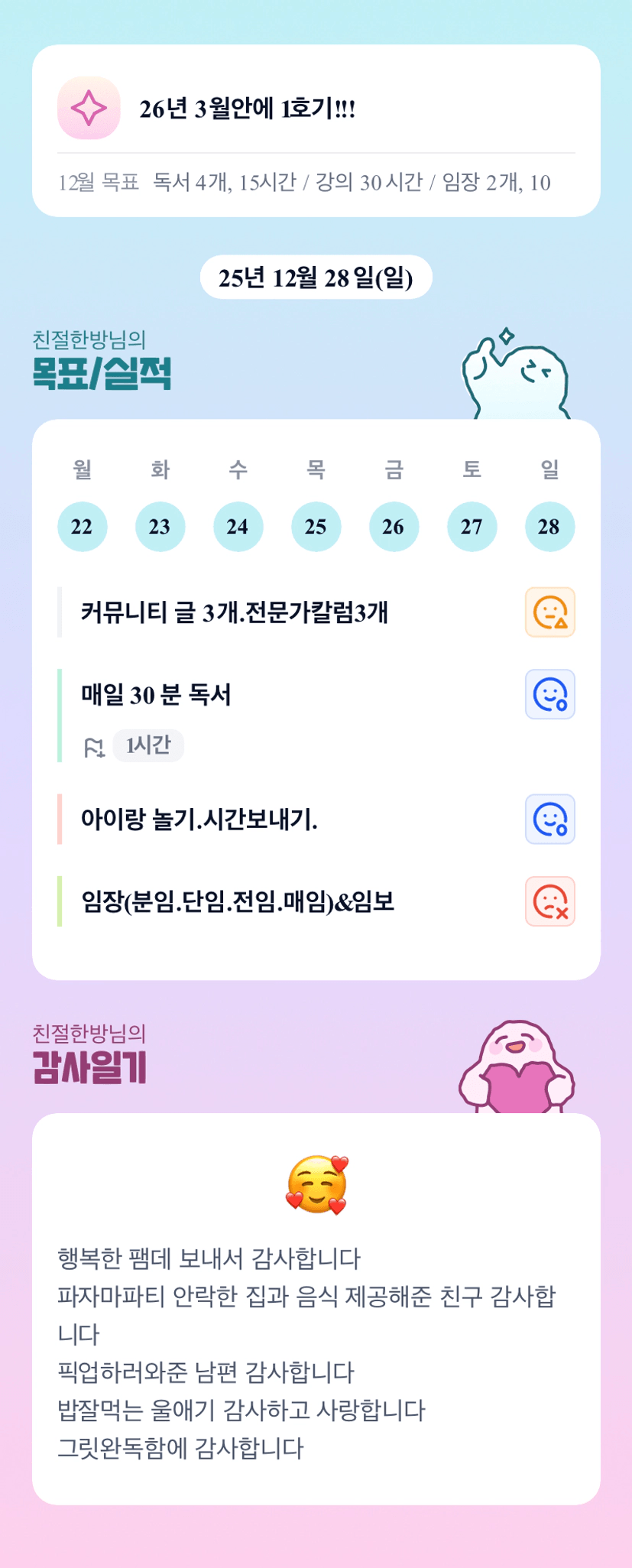 방님 독서를 정말 잘하시네요!! 벌써 완독이라니 넘 멋지세요❣️ 가족분들과 행복한 주말 되셨다니 다행입니다🥰