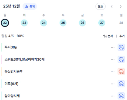 예) 토요일부터 목요일까지 목실감을 쭉 하루하루 적어보면서 스스로 중요한 부분은 놓치지 않고 해낸 것 같아 뿌듯하다.