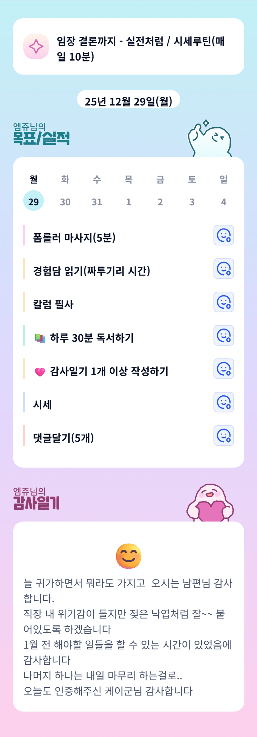 와 오늘도 갓벽한 하루를 사셨군요👍👍 고생 많으셨습니당~!! 조장님도 케이군님도 모두 정말 멋지십니다😊😊 편안한 밤 보내셔욤!!