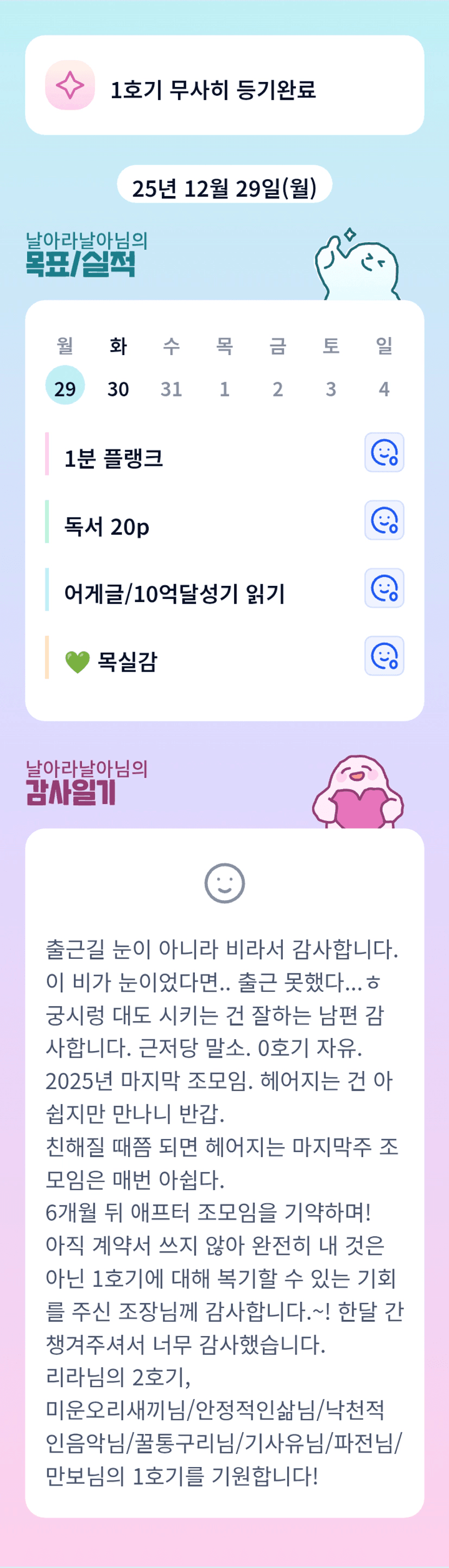 날아님~ 1호기 내년 1월에 계약 잘 마무리하시고, 6개월 후 꼭 만나요♡ 눈이 아닌 비가 와서 다행인, 긍정적인 시선 좋아용😊👍