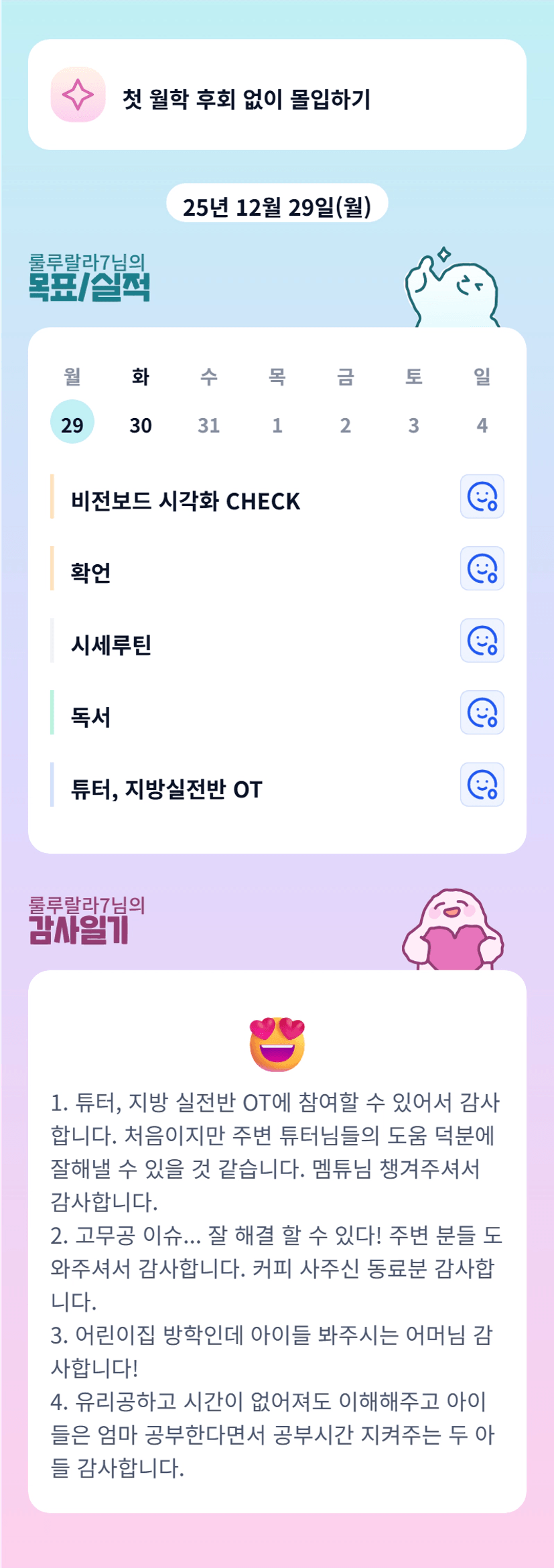 랄라 튜터님 되신 것 너무 축하드립니다. OT에서 뵈었는데 튜터로 너무 멋져요. 은근 기대중 ㅎㅎ 오늘 하루도 행복한 하루 되세요^^