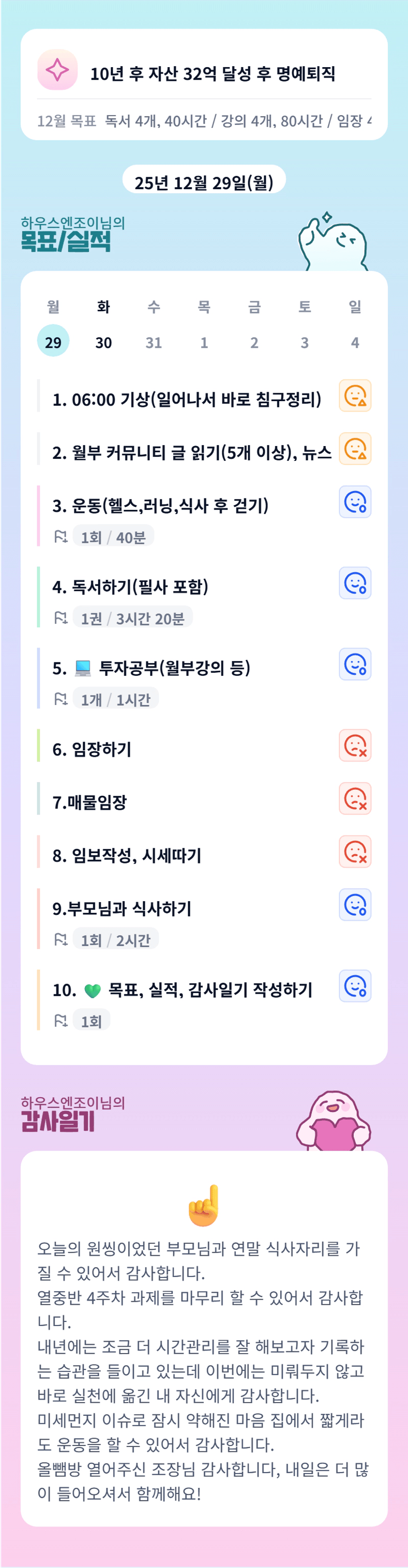 홈트도 하시고 독서도하시고 올뺌도 하시고, 부모님과 식사도 하시고 정말 알차게 하루를 보내셨네요!
