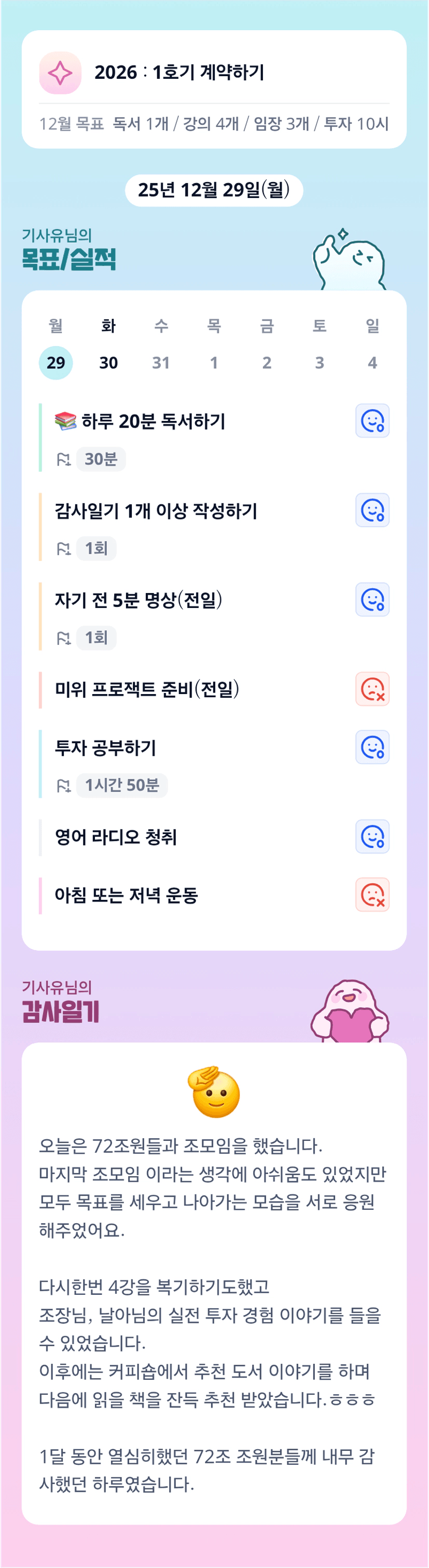 기사유님 독서 목록 공유 감사합니다 ㅎㅎ 저도 10분 독서부터 시작해봐야겠어요~ 목실감 내용도 다 알차네요! 한달 고생 하셨어요~ 팟팅입니다 ㅎㅎ