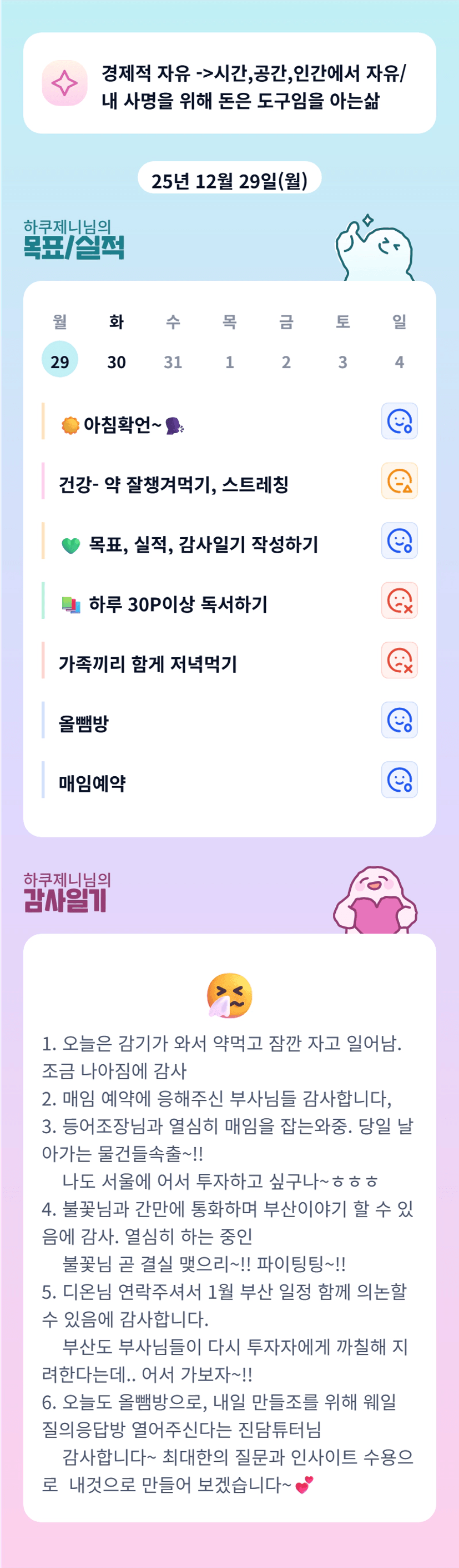 제니님 오늘도 활기차고 건강한 하루 되세요. 컨디션 관리 화이팅 입니다^^
