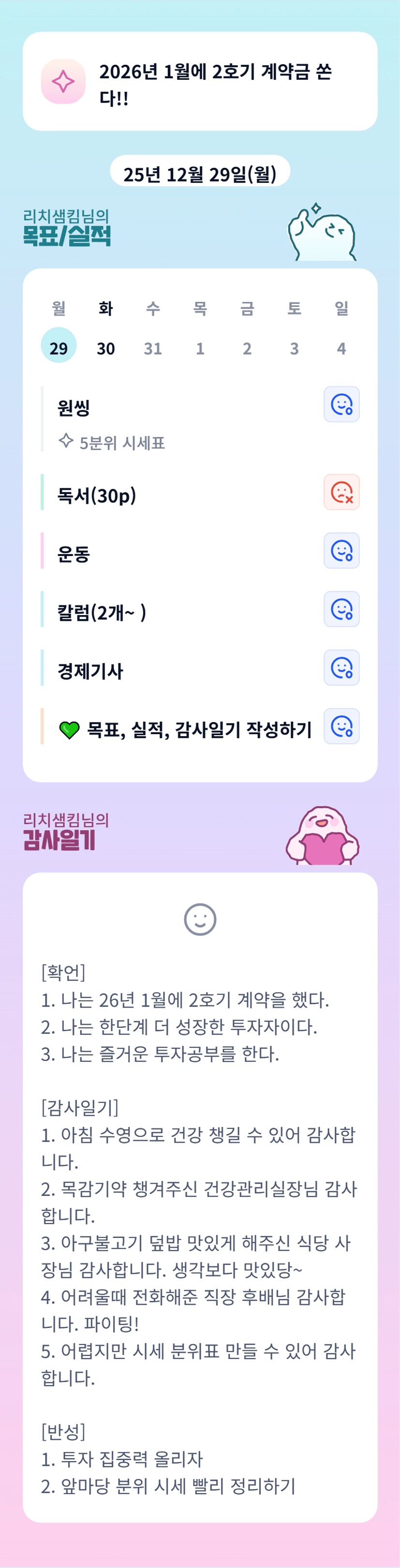 우왕 시세분위표 만드신 샘킴님 짱짱입니당👍👍 아구불고기덮밥 어딘지 기대되는 이름인데요?!😊😊 25년 투자자로서 또 현생 살며 매일을 멋지게 채워나간 샘킴님 멋지십니당~25년의 마지막날 즐겁게 보내시고 멋진 26년 새해 맞이하시길 바랍니다앙😄😄