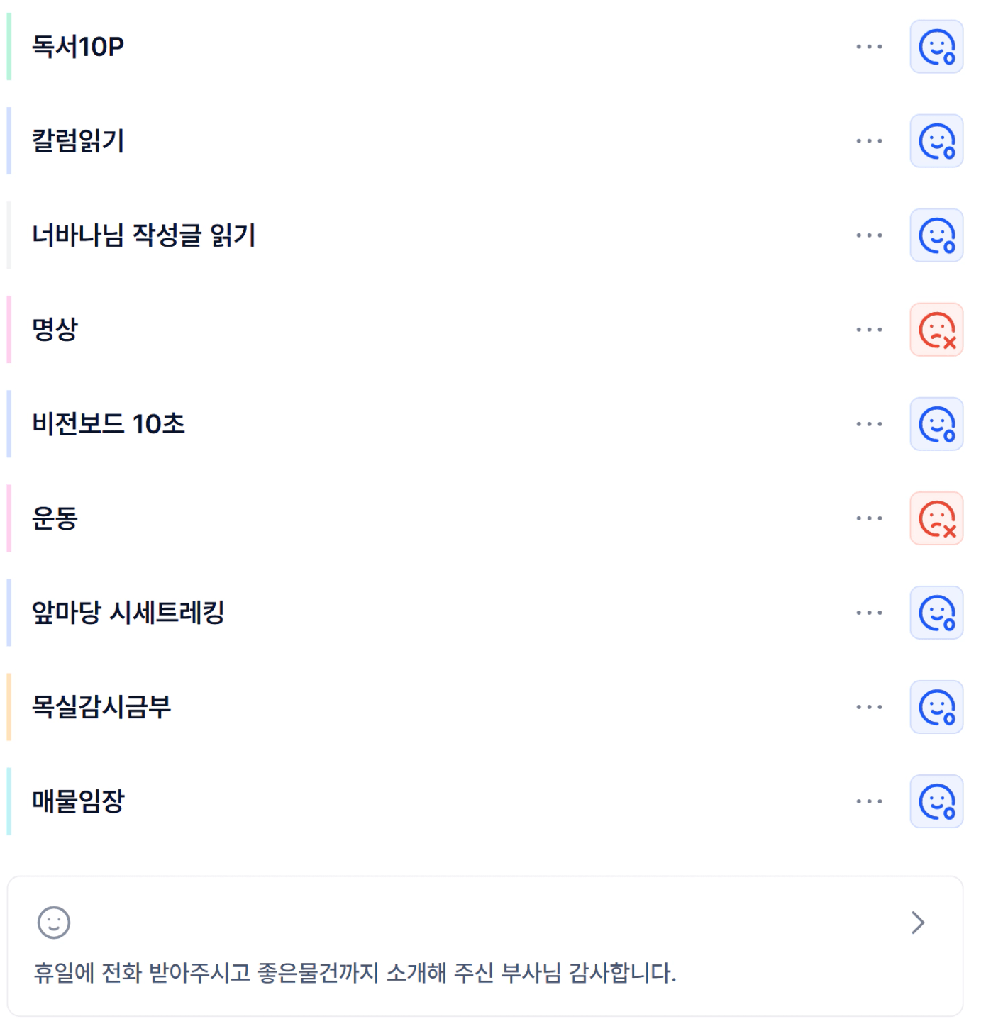 나는 건강한 사람이다.나는 부단히 노력하는 성실한 사람이다.나는 2025년 앞마당 10개를 만든다.나는 2026년 3호기 투자한다.나는 2028년 4호기 투자하고, 순자산 15억 달성한다.나는 2030년 5호기 투자한다.나 우가행은 해내는 사람이다.나는 한다.나는 해낸다.나는 반드시 된다.