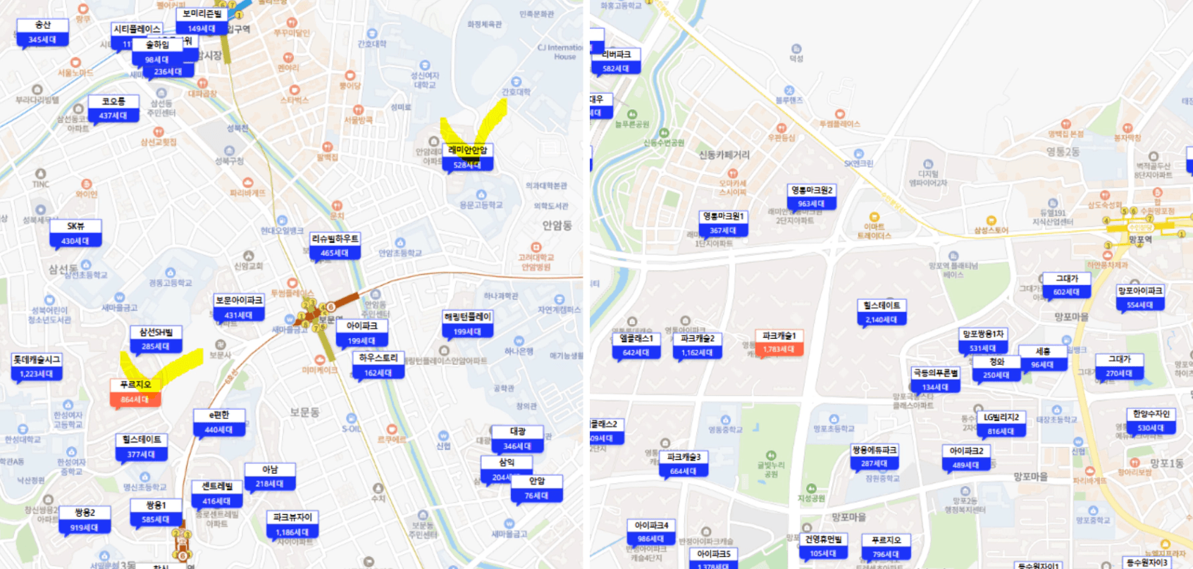 그러나, 두 단지 모두 오르막이 좀 심한 편이라는 점이 아쉽고 보문역 주변이 상권 인프라가 많지 않고 정돈되지 않은 분위기이기 때문에 선호도가 높은 생활권은 아니라는 점이 약간 아쉬운 부분이네요.