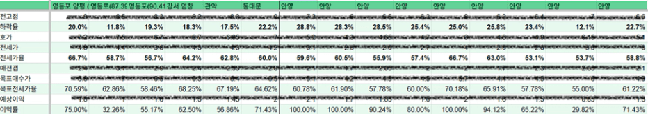 당시 수도권은 전고점 대비 20% 이상 하락한 매물들이 보였고, 튜터님들은 "지금이 기회다"라고 외치시던 때였습니다. 저는 서울 4급지와 수도권(용인, 안양)을 중심으로 앞마당을 늘려갔지만, 종잣돈의 한계로 20평대 대단지는 제 눈에 보이지 않았습니다.