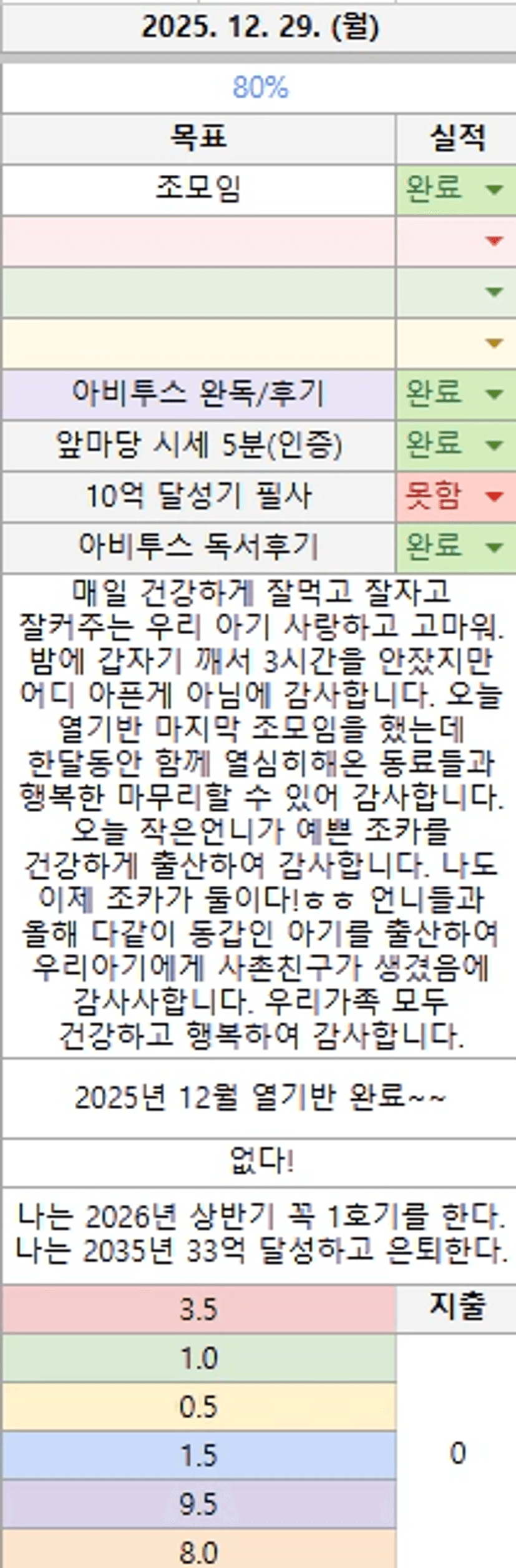 #자기암시나는 항상 투자를 생각하고 실천하는 실전투자자이다나는 시간을 소중히 여기고 과정을 즐기며 목표를 달성한다나는 작은 것에도 감사한다나는 매 순간 실력을 쌓는데 집중하고 성장하여 시장에서 살아남는 투자자가 된다내가 꿈꾸는 삶으로 만들기 위해 오늘도 열심히 노력한다나는 할 수 있다.