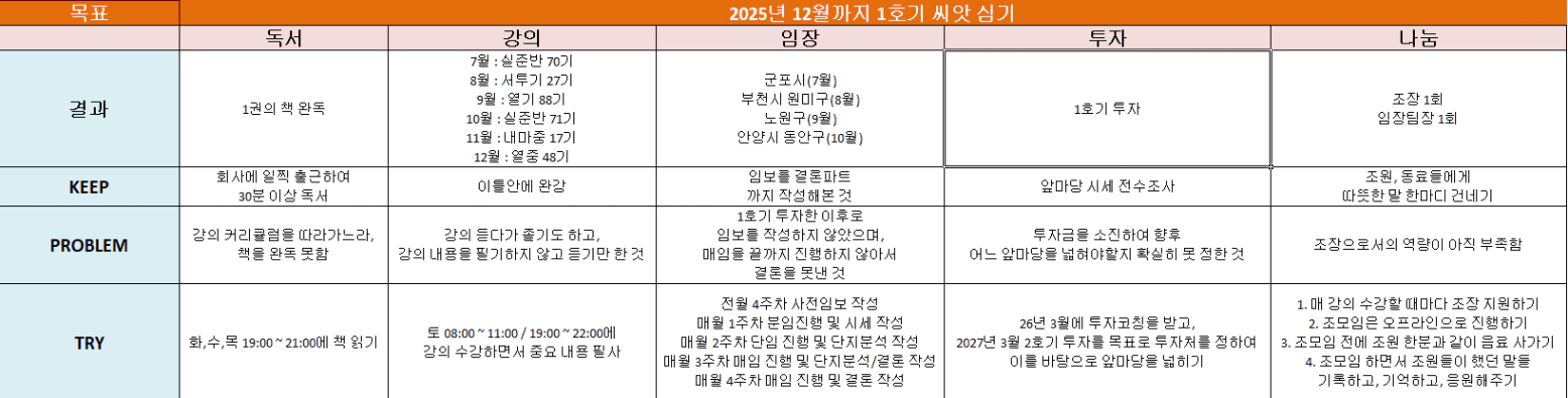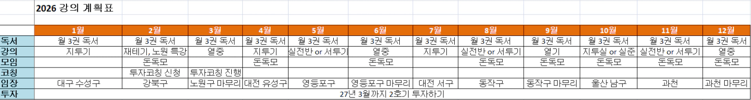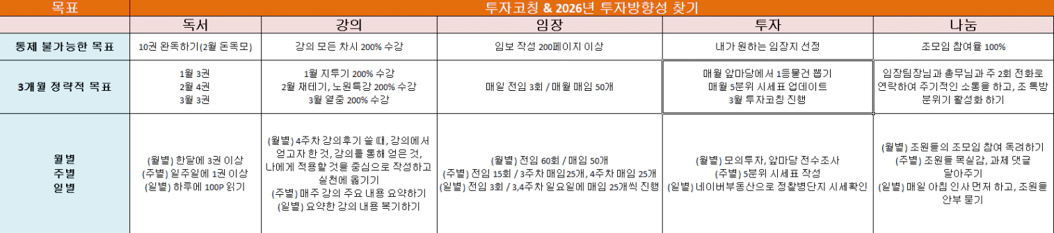 1월에 지투기 들으면서 지방 임장에 대한 감을 익히고, 2월에 투자코칭 신청하여 3월에 코칭을 받고 2호기 투자 방향을 확실히 세워서 앞마당을 넓혀가도록 하겠습니다.