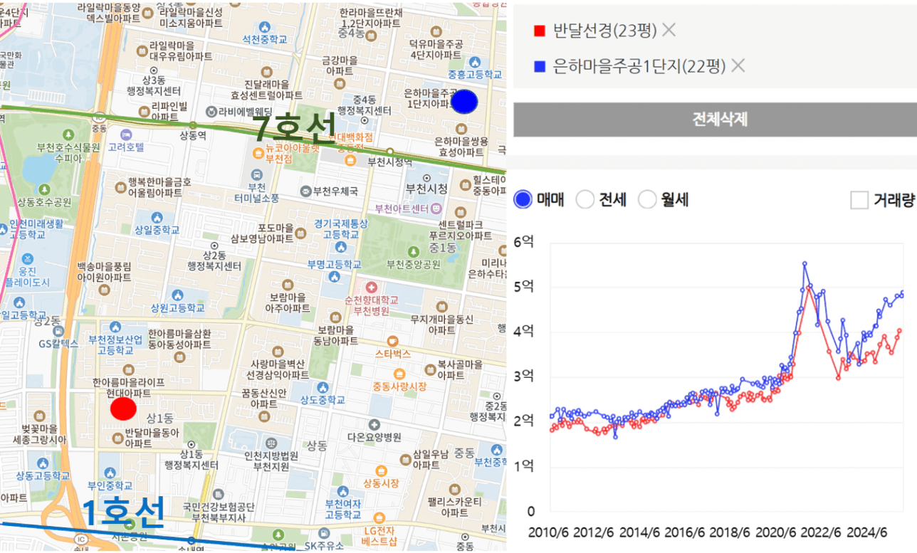 부천에서는 1호선보다 강남으로 바로 갈 수 있는 7호선의가치가 더 높고, 7호선라인으로 상권이 조성되어 있어 입지가 더 좋습니다.