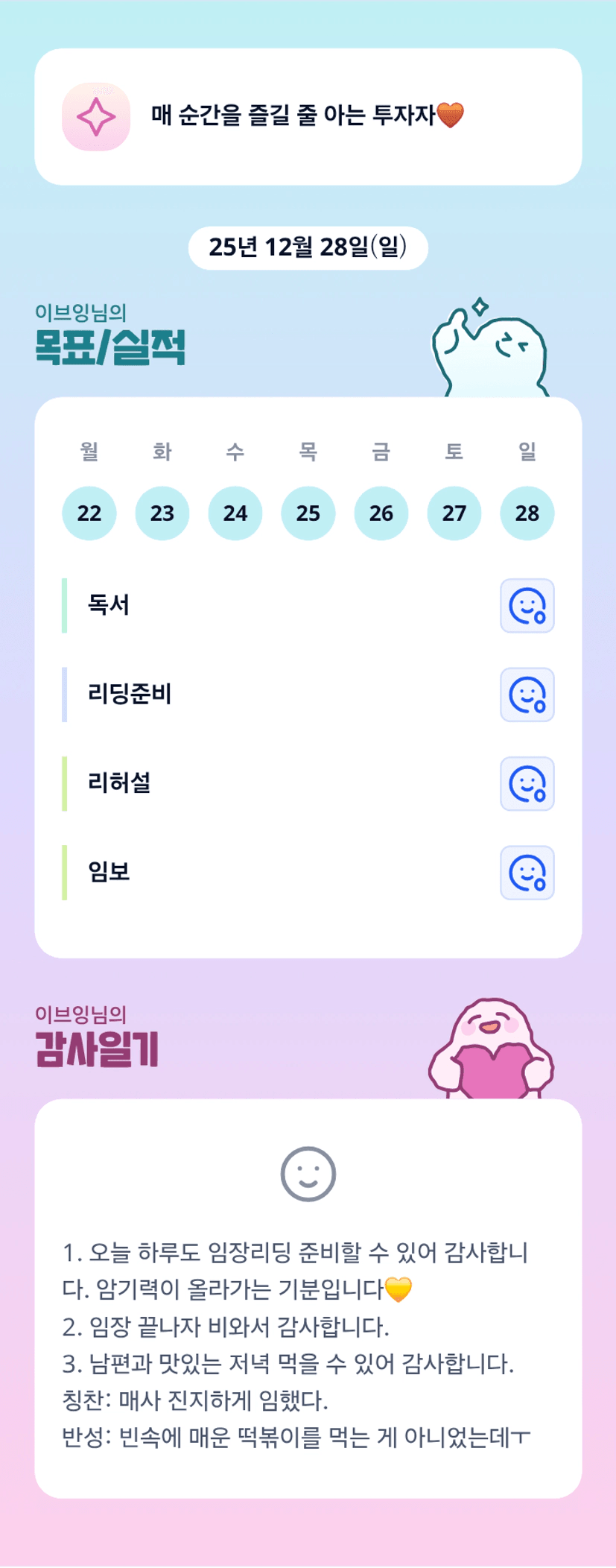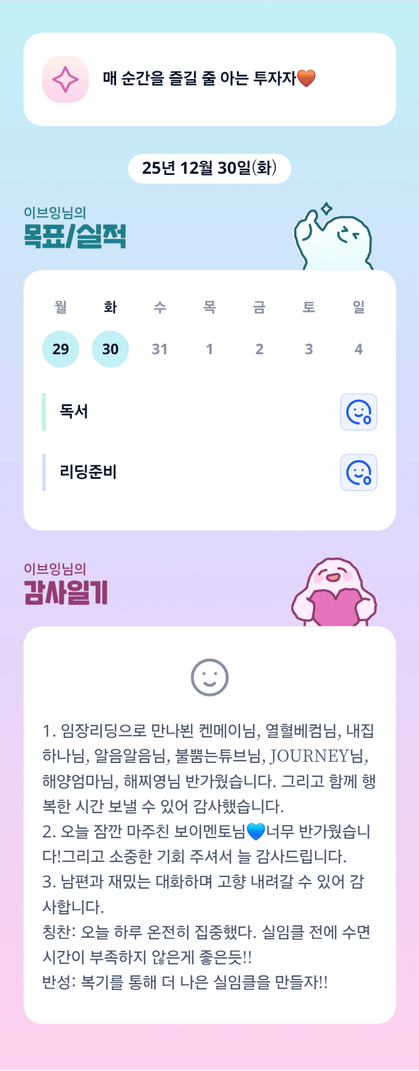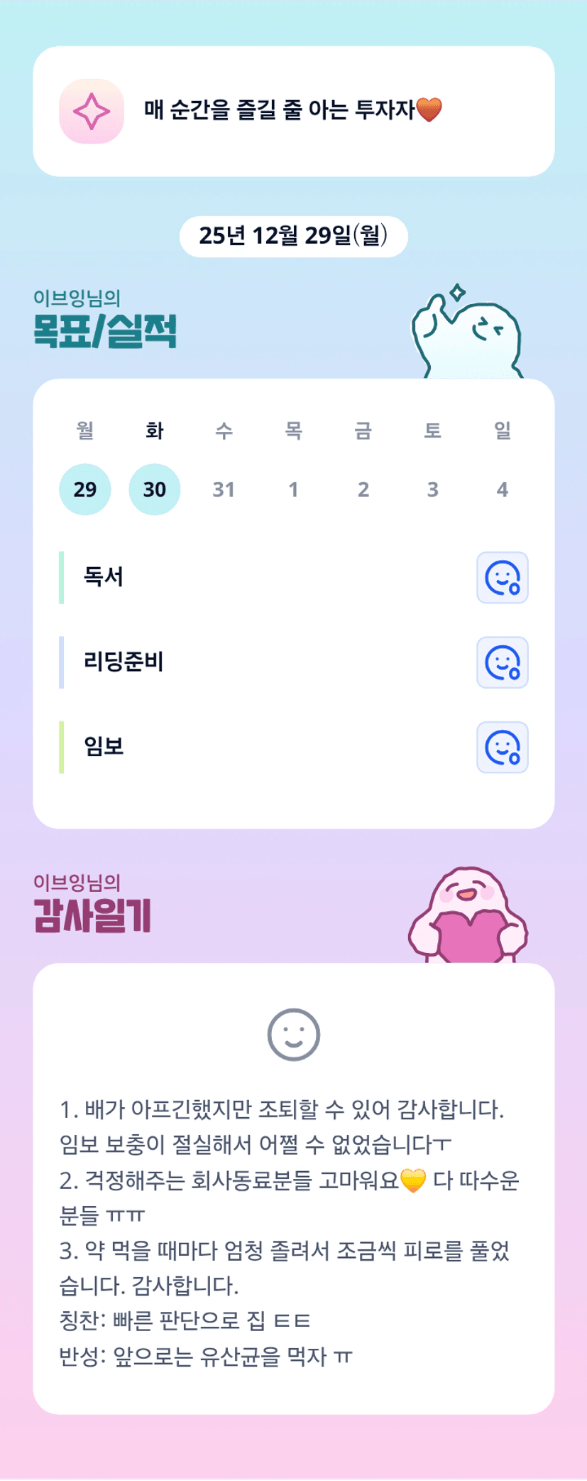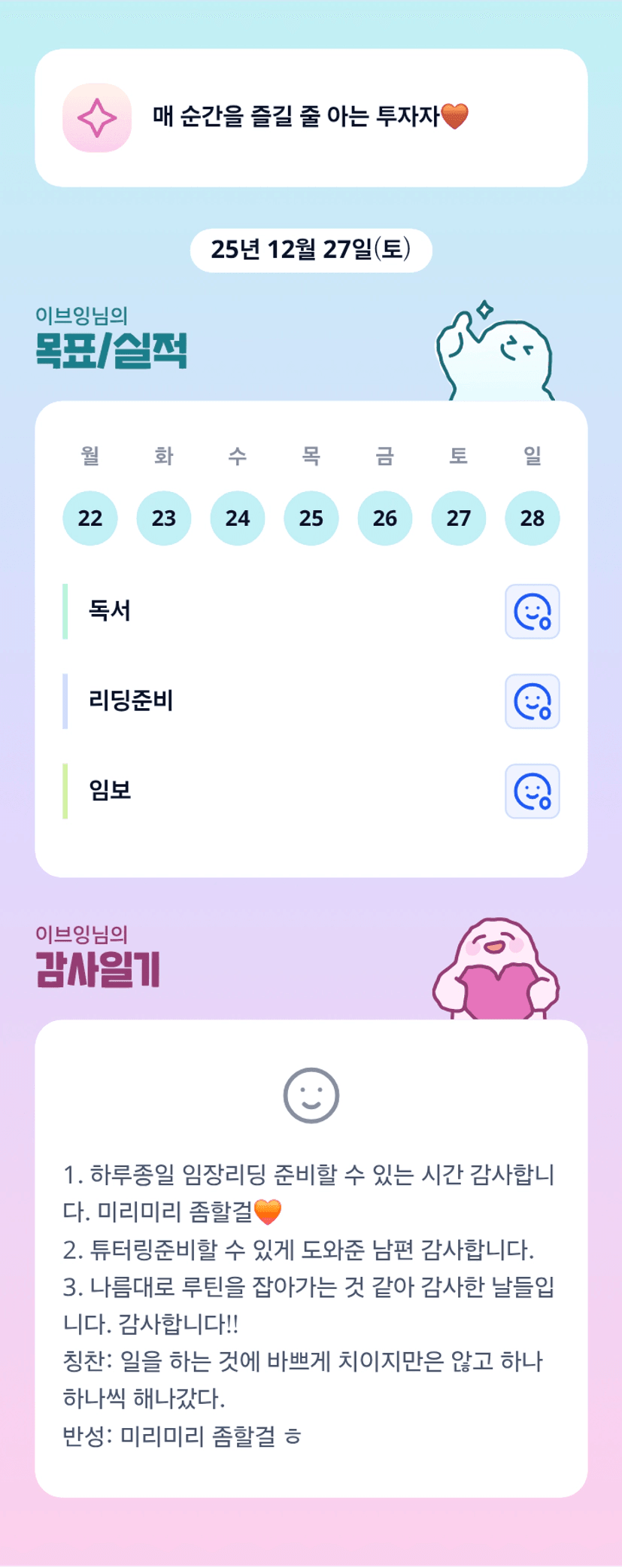매일 엄청 열심히 치열하게 최선을 다해 사시는 쁘잉튜터님 멋있어요...🥹 항상 건강먼저 챙기시구요!!!!늘 응원하고있슴다