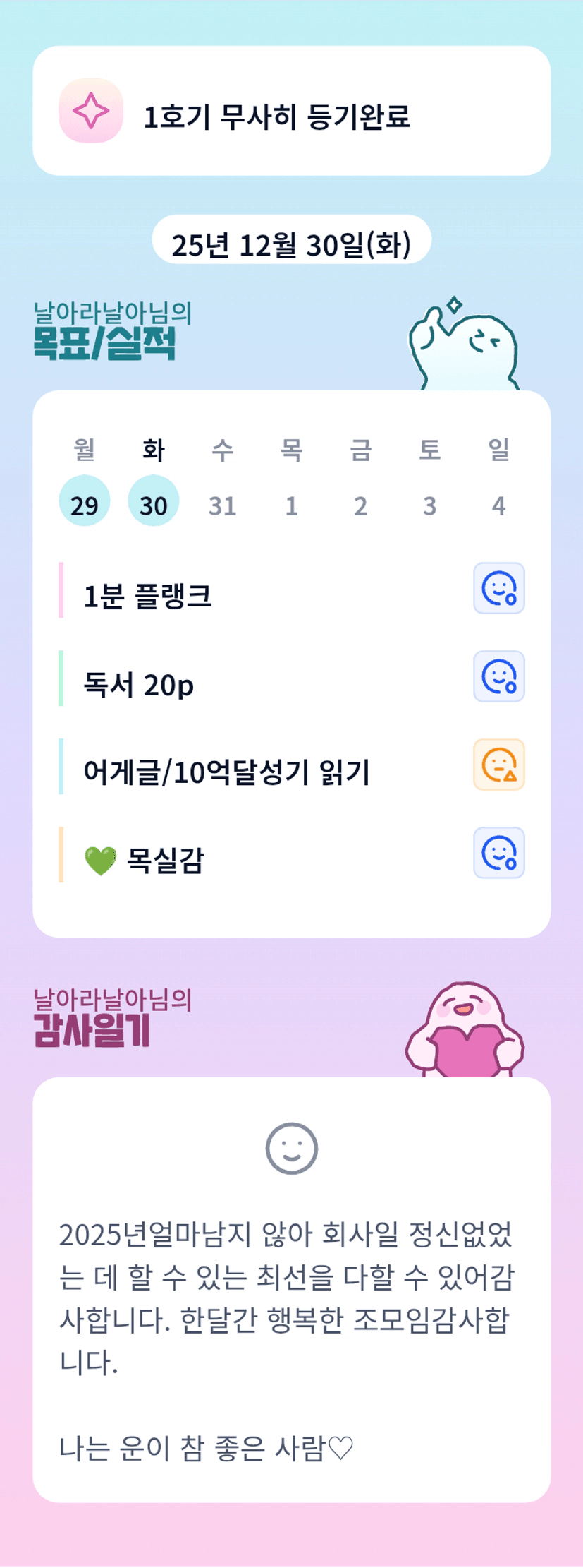 날아님~ 업무 많은 날이었군요. 업무 잘 마무리하고 올뺌까지 열공하는 날아님 멋져요^^ 늘 세심하게 배려해주시고 따뜻한 말 건네주시는 것도 감사합니다♡