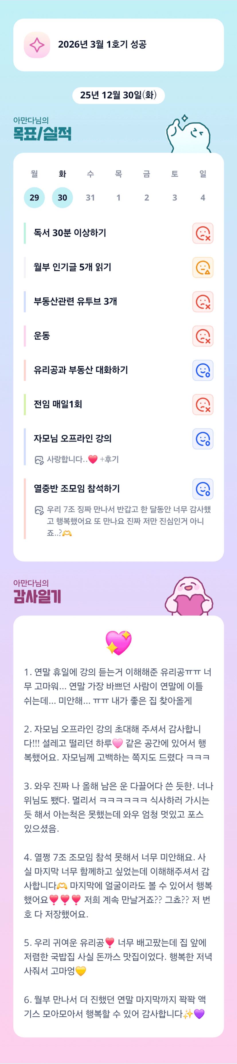 행복으로 가득한 아만다님의 연말! 마지막 조모임에 서프라이즈로 등장해주셔서 감사합니다 ㅎㅎㅎㅎ 몸이 10개라도 부족하신 아만다님의 부지런함이 곧 행복을 만드시는 것 같습니다~~ 내년에는 더 큰 행복을 누리시기 바랍니다!
