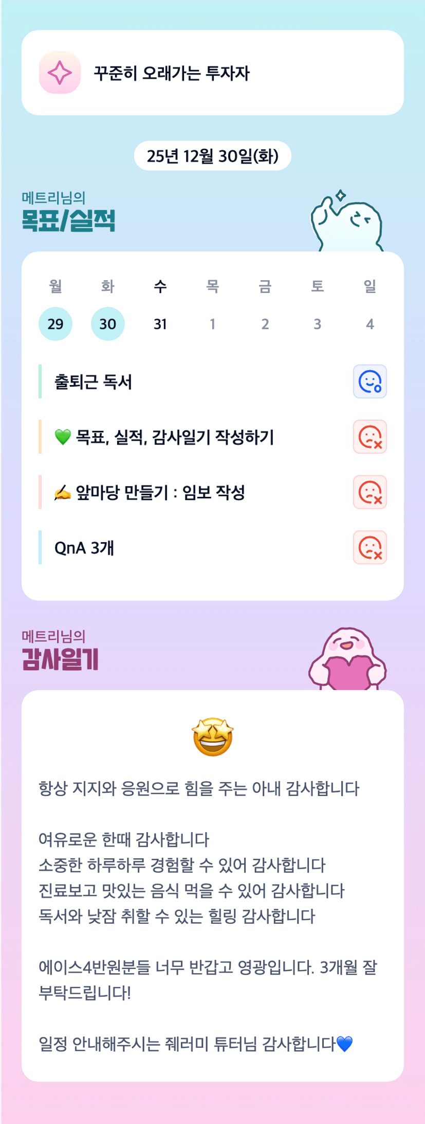 트리님 ㅎㅎ 이번 3개월 잘 부탁드려요!! 트리님 닉네임 부를때마다 뜻때문에 괜히 기분이 좋아지네요 :-) ㅎㅎ