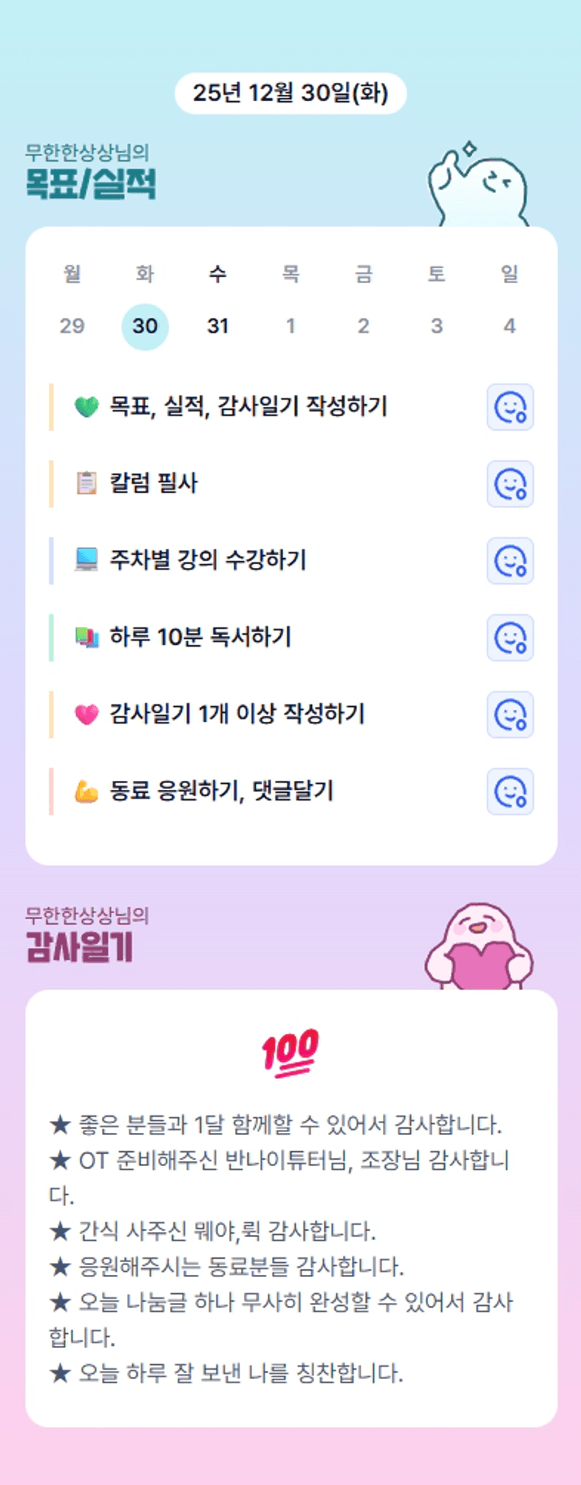 상상님 ! 목표 모두 달성이라니 .. 👍🏻 대단하십니당 ! 한 달 동안 많이 배우겠습니다 ~ 화이팅 !!