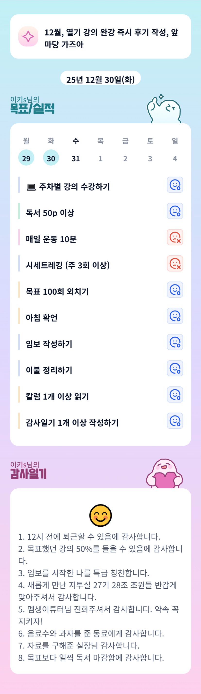 이키s님!! 덕분에 좋은 기운도 받고 늘 꾸준한 모습 넘 보기 좋습니다^^ (보면서 가끔 반성도 하게 되고요ㅎㅎ;;) 올해처럼 너~~무 빛나는 열정 내년에도 이어가시길 바랄게요!! 화이팅!!😍✨
