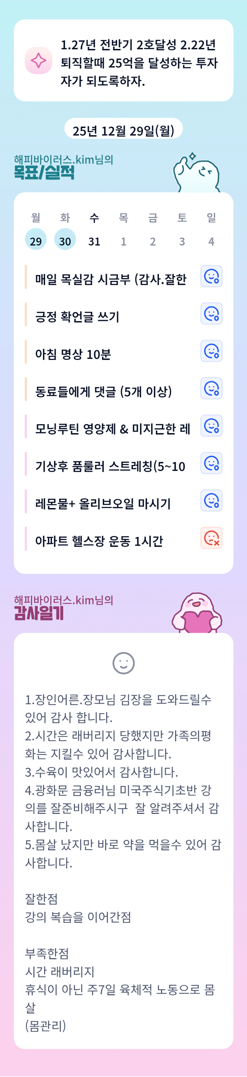 육체 활동이 많으신데 회복시간이 적은 부분이 개선되어서 항상 건강하시길 응원합니다. 25년 수고 많이 하셨습니다^^