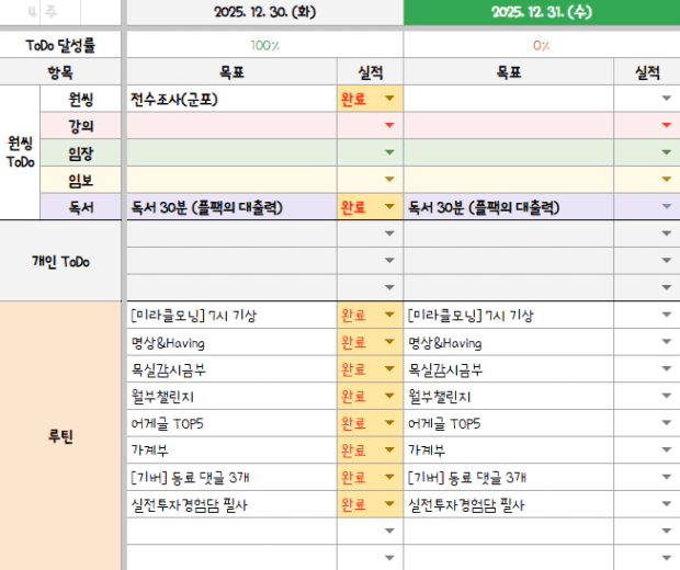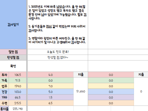 [정의] 2025년 12월 31일 목표, 실적, 감사일기