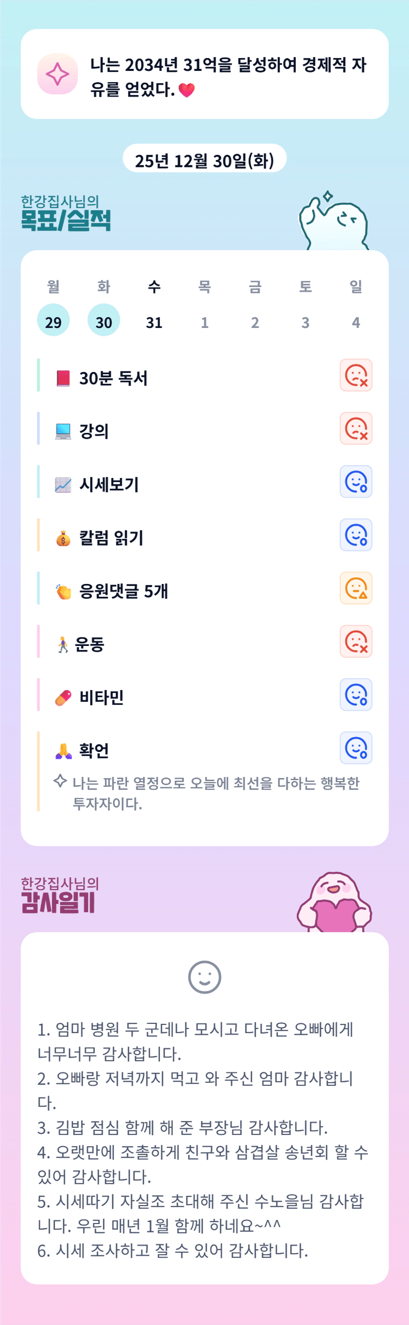 한강님 짱짱👍👍 넘넘 잘하고 계십니당~저도 열심히 잘 해보는것으로다가!! 1월 함께해요옹😆😆