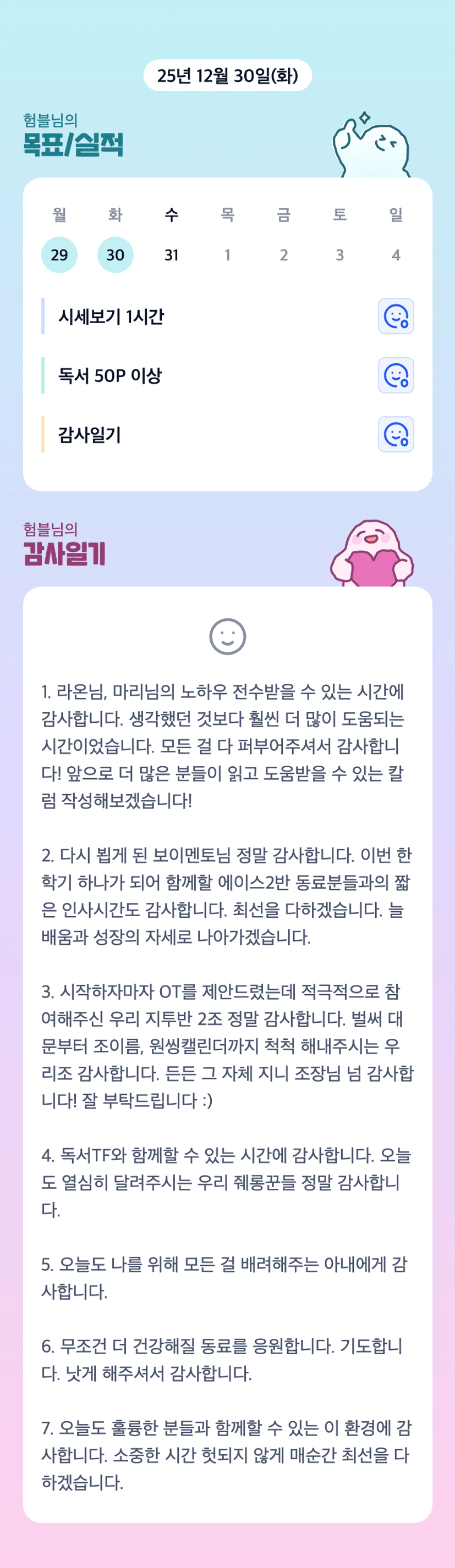 지난번에 선배와의 대화에서 뵈었는데 지투 튜터님으로 뵈니 더 반가웠어요 동료들이 그러는데 저희조가 엄청난 조더라구요? ㅎㅎ열시미 성장해보겠습니다!!
