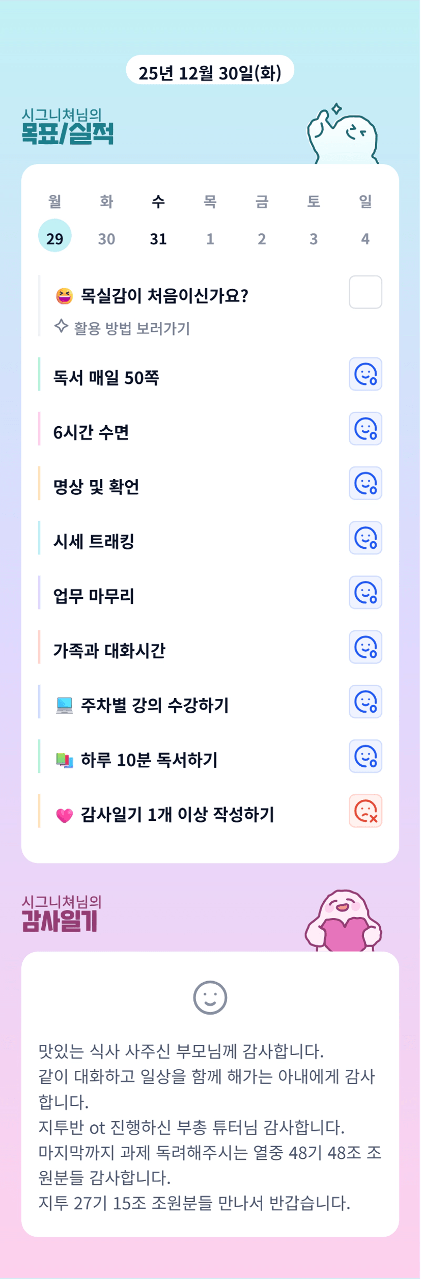 이번 한 달동안 잘 부탁드립니다 시그니쳐님^^!! 오늘도 화이팅입니닷!!
