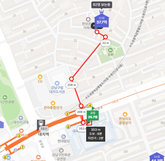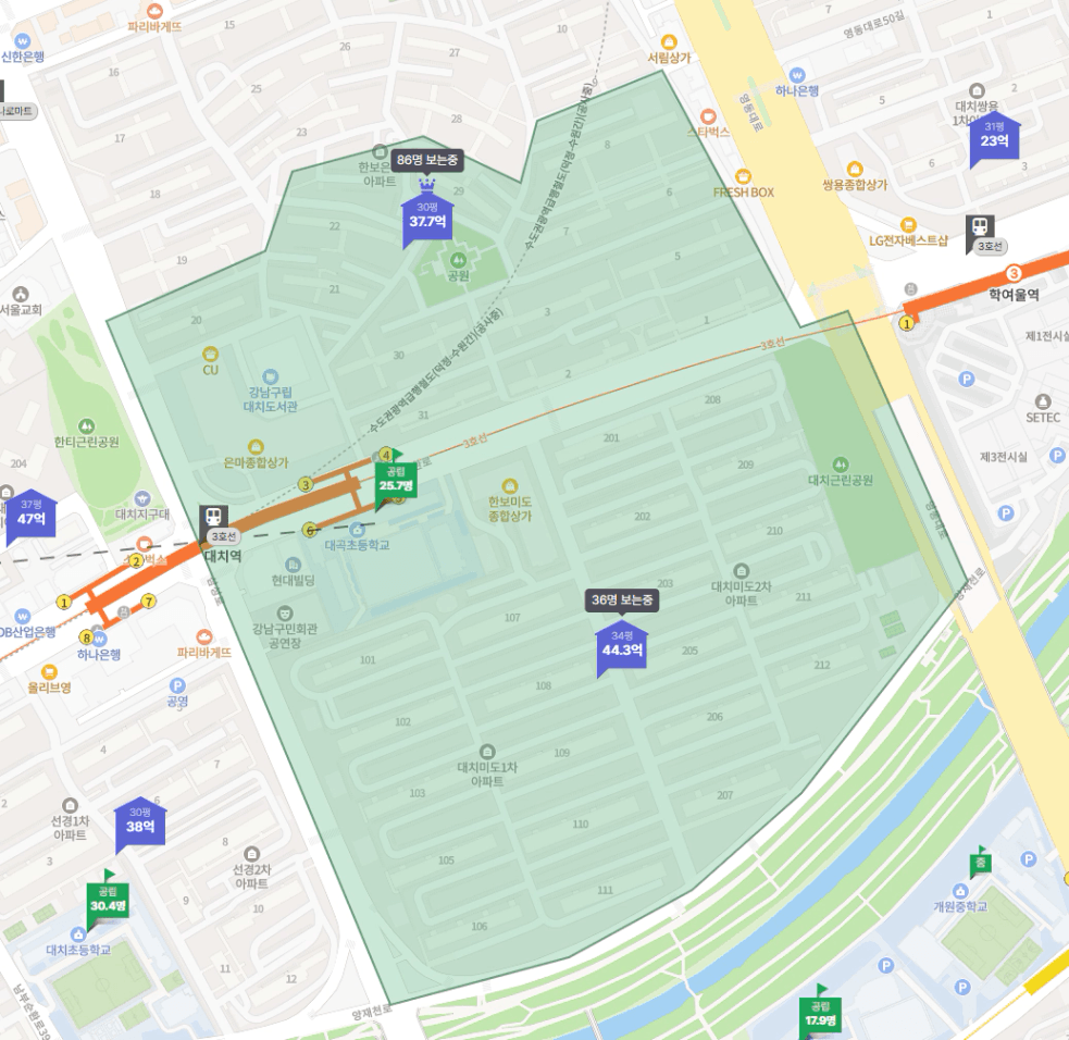 • 학원가: 학부모라면 필수입니다 학원이 모여있는 곳이 어딘지 빨간색 영역으로 보여줍니다.