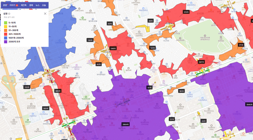 • 상권: 내 집 주변에 상권 규모가 얼마나 큰지 색깔로 표시됩니다.