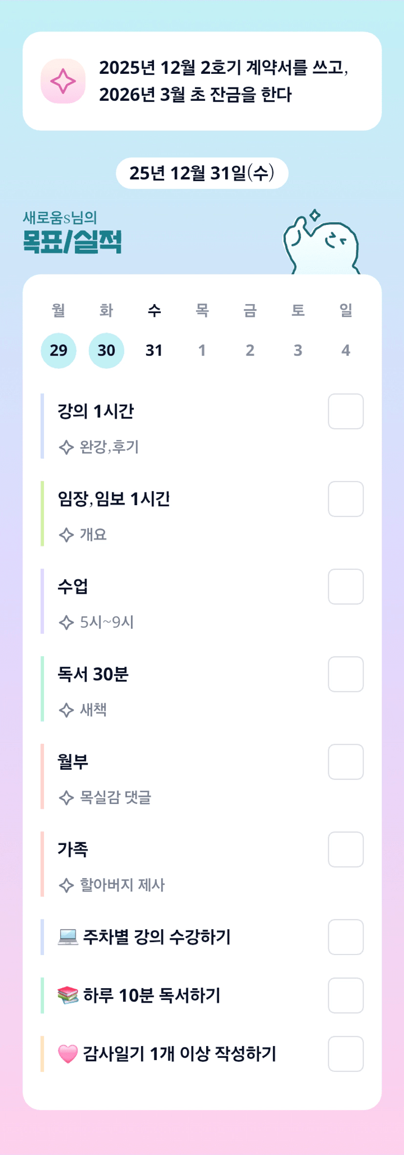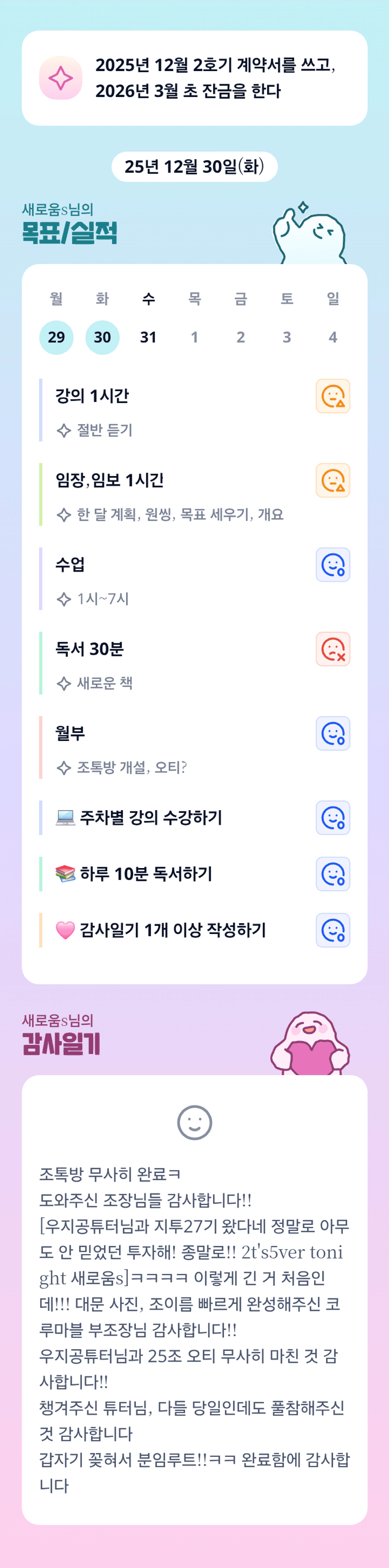 조장님~~~~~~~~~~~ 월학 달리시고 지투도 달리시고~~~~ 언제 쉬시나요? ㅋㅋㅋㅋ 25년도 움조장님 만나서 행복한 한해였어요^^ 좋은 동료로 함께 할 수 있도록 저도 열심히 실력을 키워볼께요!!! 움 조장님 따라가기 힘듬 ㅋㅋㅋ 26년도에도 늘 건강하시고 더 부자되세요!!!