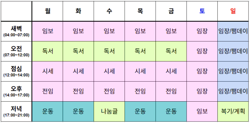 운동과 독서, 팸데이, 계획 등의 시간도
