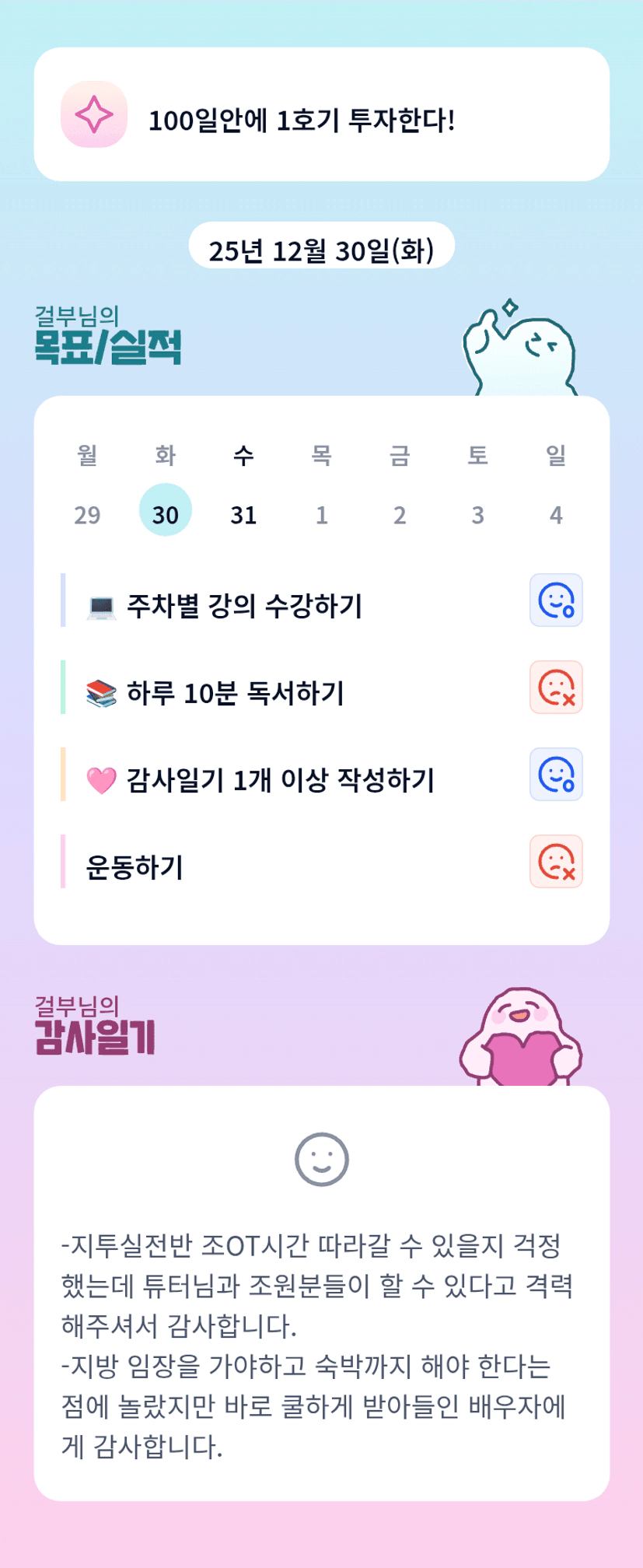 걸부님 고생하셨습니다! 100일 안에 1호기 투자 응원합니다!! 한달동안 잘 부탁드려요 :)