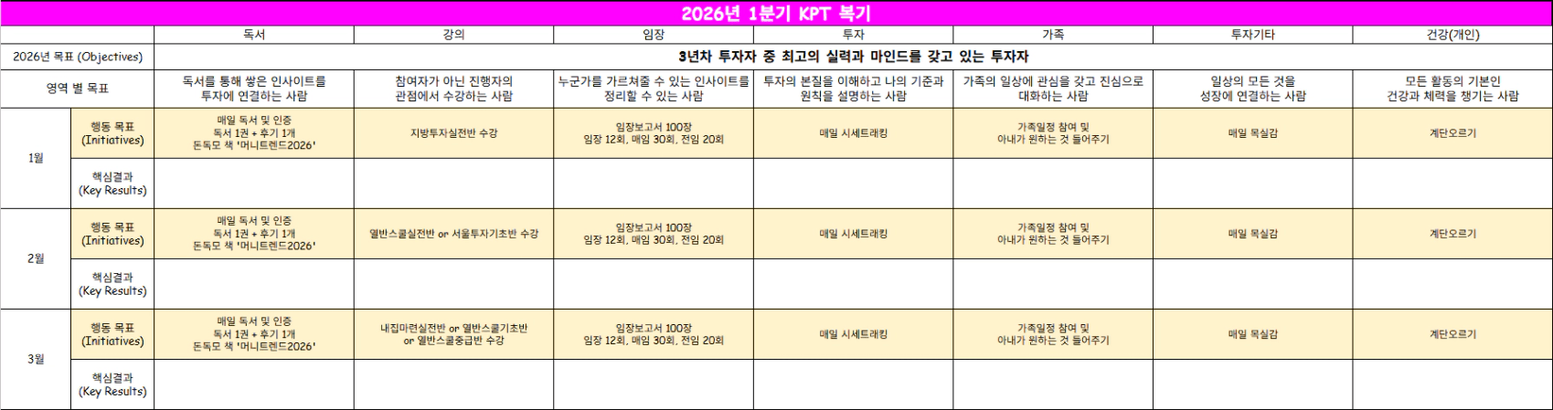 2026년 1분기 KPT를 ‘독서, 강의, 임장, 투자, 가족, 투자기타, 건강(개인)’ 카테고리로 나누어 작성했습니다.