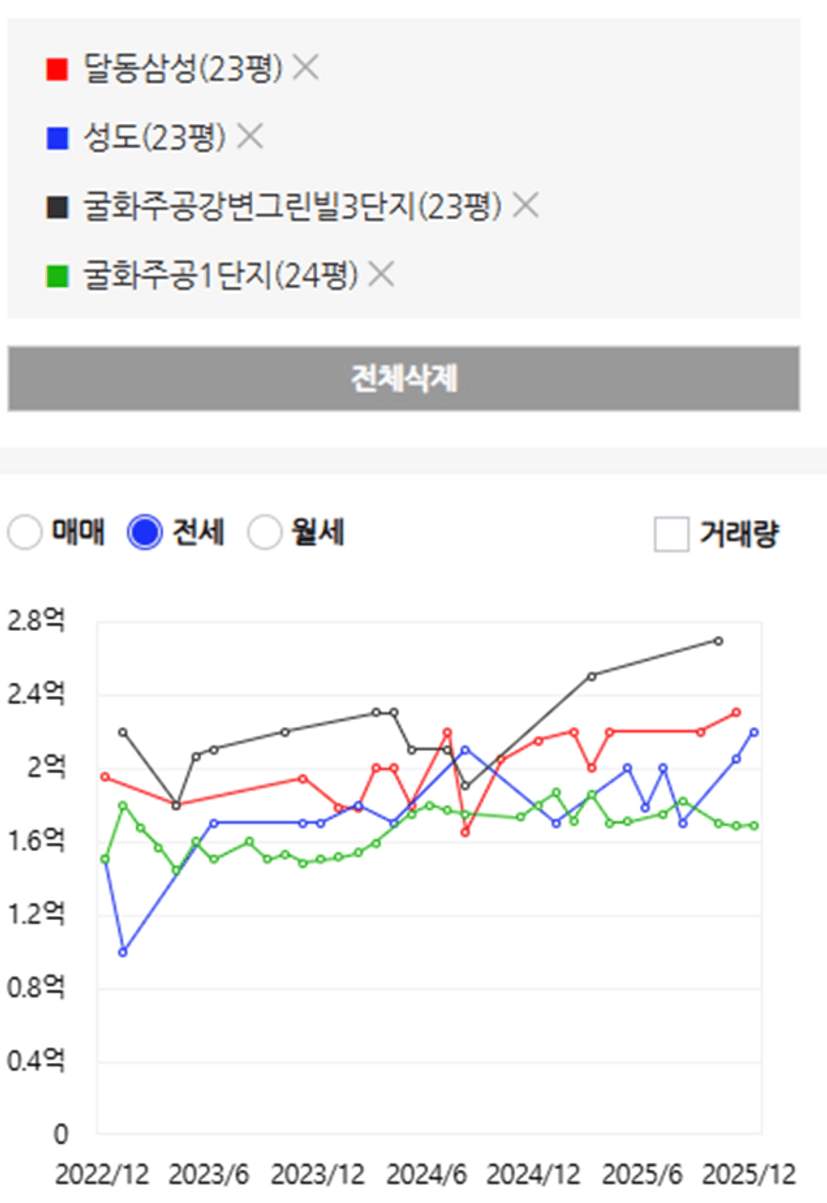 모든 단지들이 작년 12월 대비 전세가격이