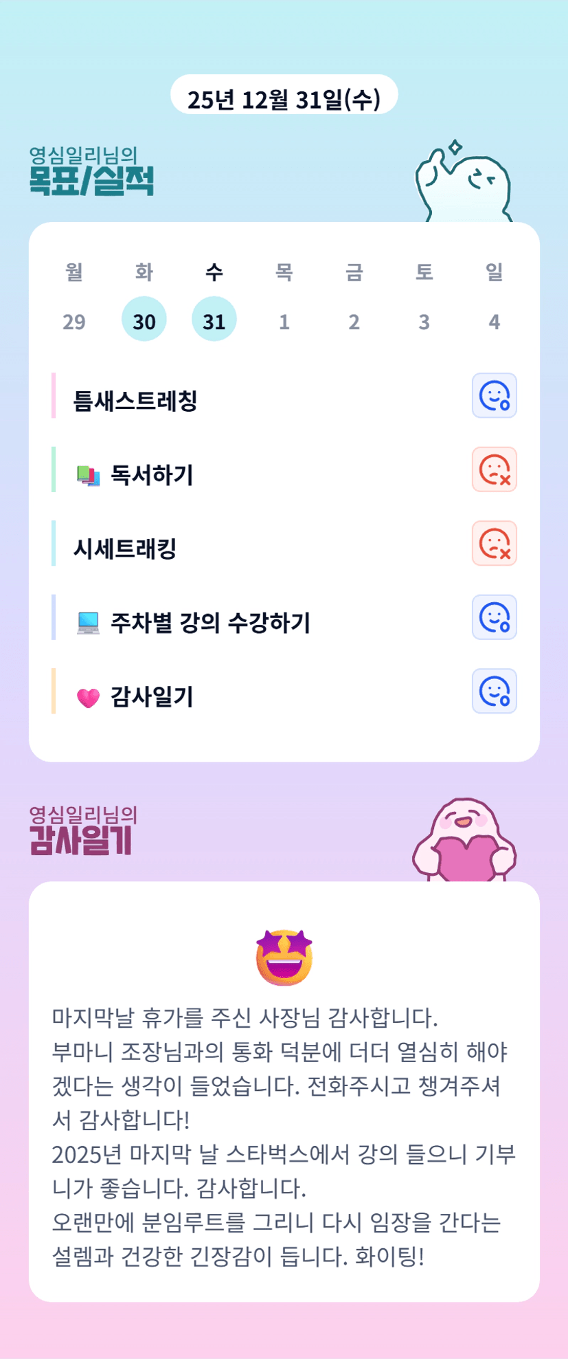 마지막 날 휴가 너무 좋으셨겠어요!내년 한 해도 행복한 일 가득하실 거예요🧡고생 많으셨습니다아!