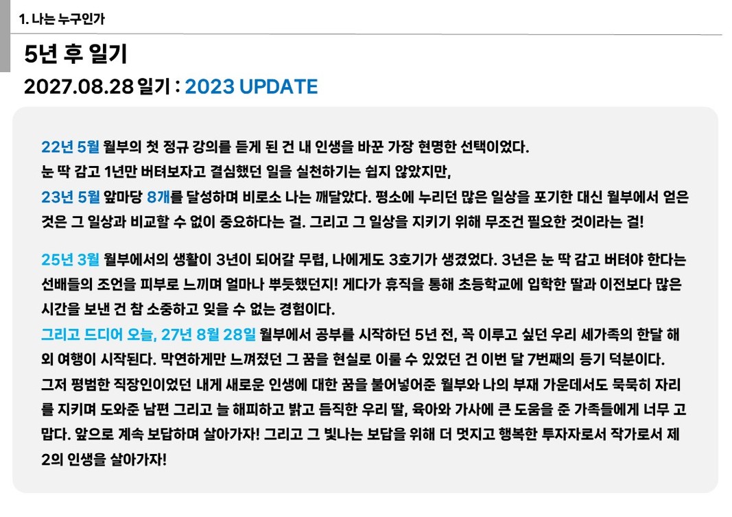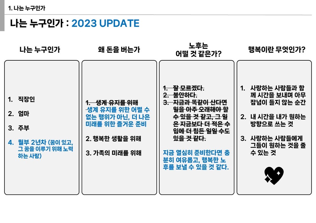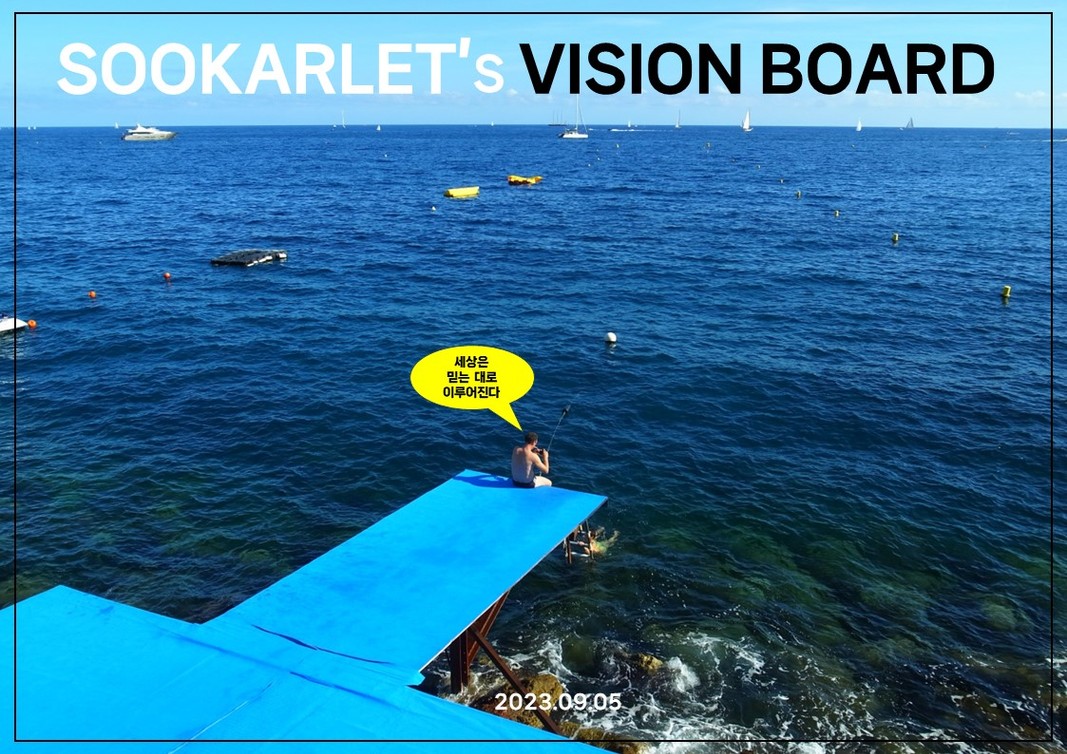 아무튼 그래서.. 저의 비전보드는요? 2023년 버전으로 수정을 해보았습니다. (블루 컬러로 강조!!) 그리고 저 이제 내년에 열기 3수강 하기로 결심했으니까... 내년에 또 비전보드 수정해볼거에요. 얼마나 이루어질지 어떻게 바뀌어있을지 너무 기대가 됩니다.