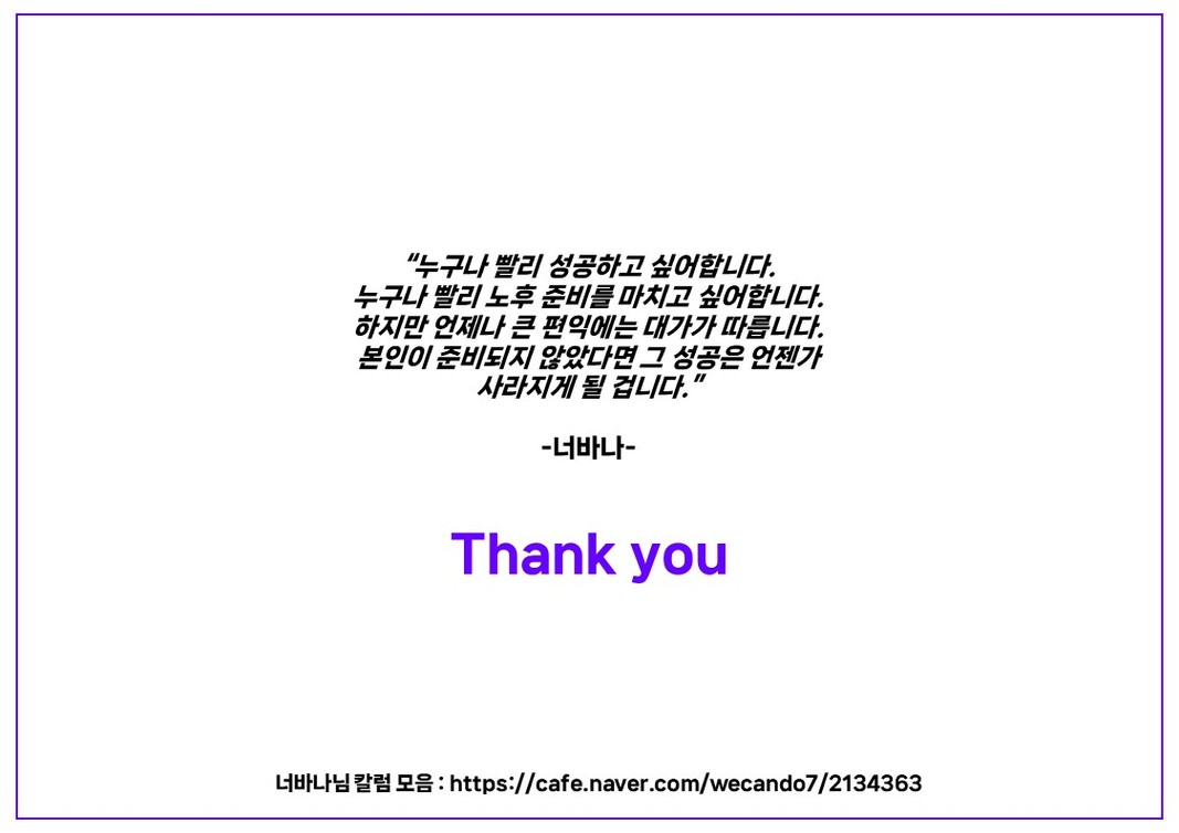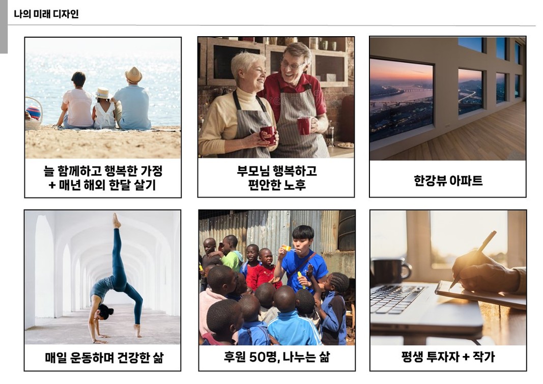 지금의 저는 미래가 불안하지 않고, 꿈꾸고 노력하고 준비하면 노후가 달라질 수 있다는 희망이 생겼습니다. 그래서 무작정 회사가 싫지도 않고, 빨리 돈을 벌기 보다는 돈을 벌 수 있는 실력을 하루하루 차근차근 쌓아가고 싶고 그 단계를 밟아가는 지금의 제가 좋아지기 시작했습니다. 그래서 그 단계를 마치는 날이 오면 물론 놀고 먹는 비전도 이루고 싶긴 하지만.. '내 힘으로 이뤄냈다'는 그 자기효능감 하나만 있다면.. 편의점에서 삼각김밥만 먹어도 행복할 것 같다는 생각입니다.