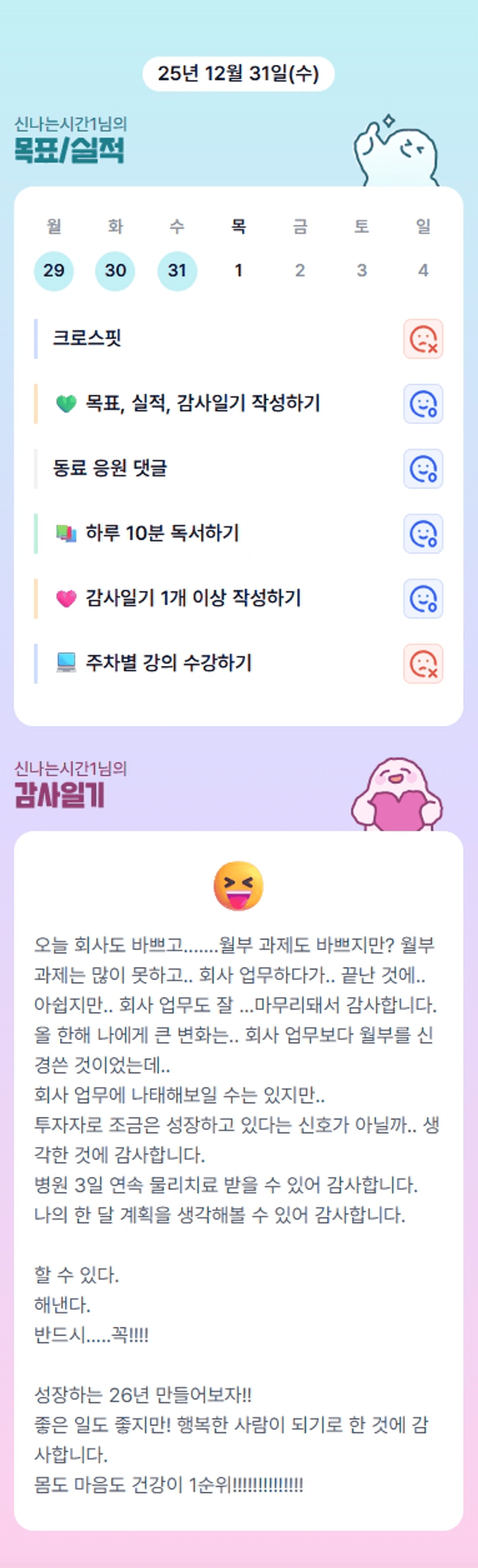 3일 내내 물리치료ㅠ 얼른 낫길요! 12월 한 달 고생 많았어요~ 시간님~ 26년에는 건강하고 행복하게 한 해 보내셨음 좋겠습니다^^ 새해 복 많이 받으세요:)