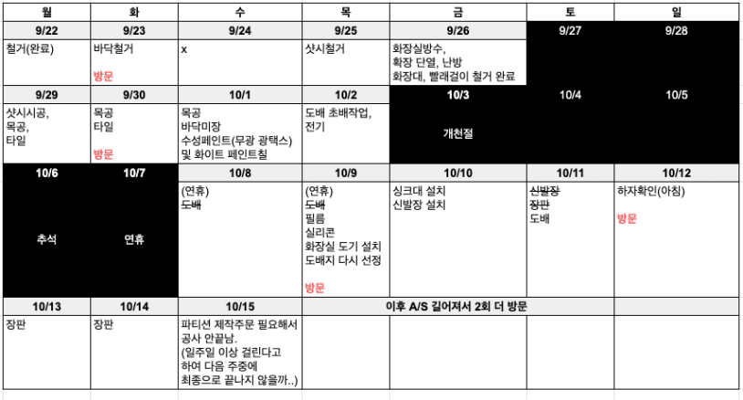 • 철거, 도배, 타일, 하자보수 일정에는 반드시 현장에서 확인하기 (문제생길 확률 높음)