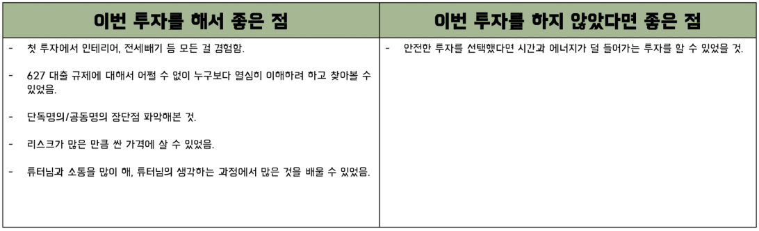 • 투자 전 매임할 때, 좀 더 명확한 수리기준을 가지고 투자금을 계산 했으면 좋았을 듯. (이건 경험의 부족. 이번 경험으로 성장했다고 생각!)
