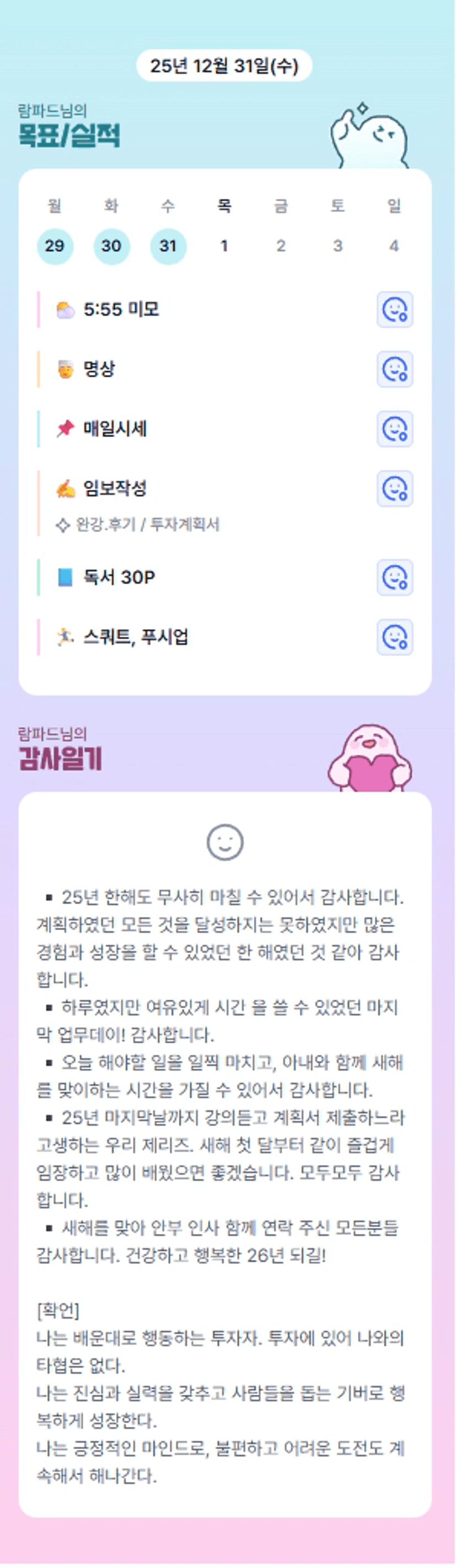 조장님 가족과 25년 마지막날 잘 마무리 하셨군요^^ 아침루틴 하시는 것 본받고 싶고, 열심히 해야겠다는 동기부여도 되었어요~ 항상 즐겁게 하자고 긍정적인 멘트로 이끌어주셔서 저도 긍정에너지 얻고 있어 감사합니다. 앞으로 잘 부탁드려요😊!