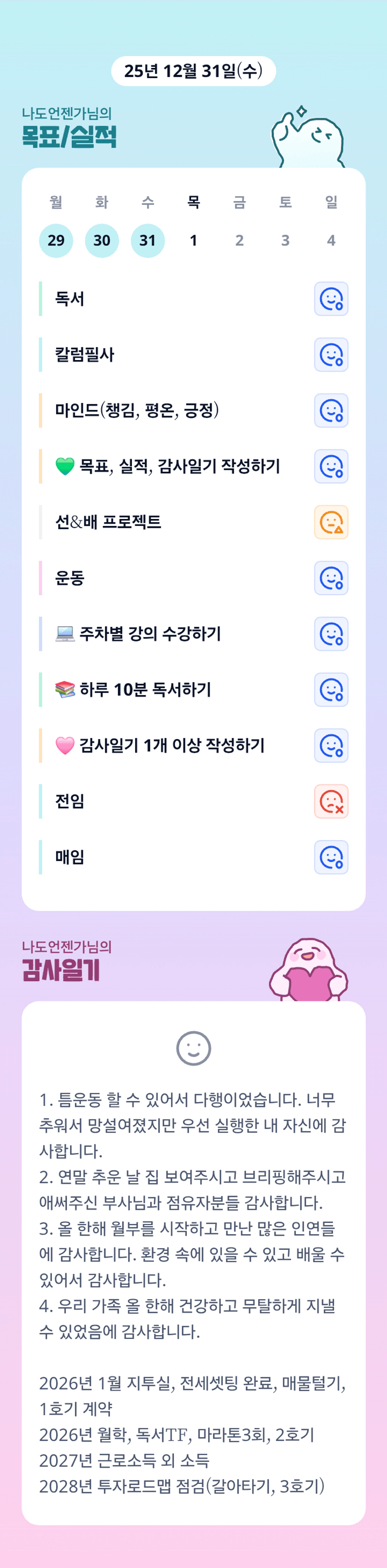 저도 젠가님을 만날 수 있어서 좋았어요! 차분하고 따숩고 다독왕에(28권 어떻게 가능한 거죠?) 완벽한 루틴까지 멋진 젠가님을 알고 있다는게 큰 복입니다~ 복 그 자체이신 젠가님 꼭 좋은 1호기 하실 거고 무탈하게 쭉쭉 2호기 3호기 하실 겁니다! 26년 새해 복 많이 받으세요오!!