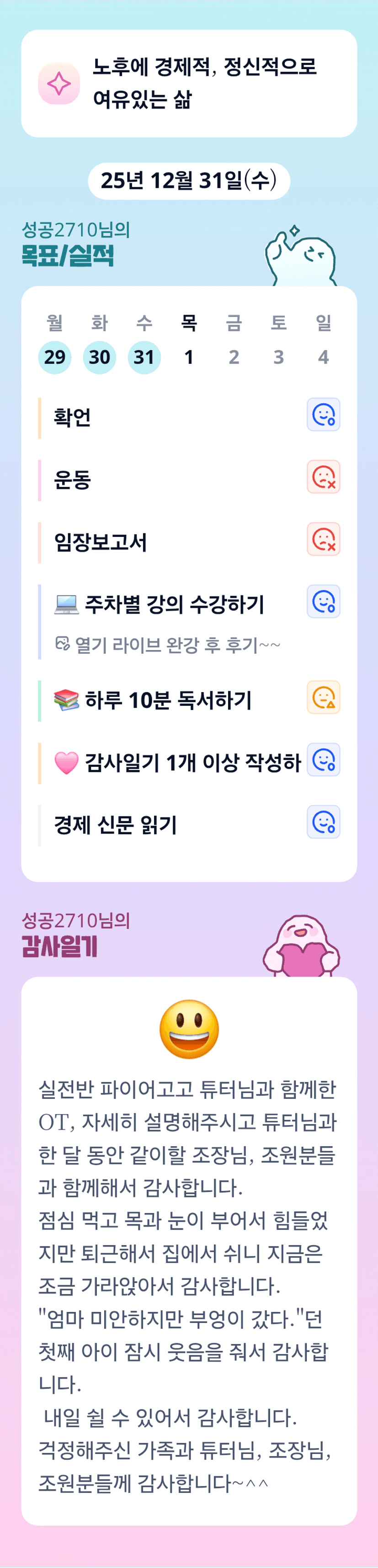 이번 한 달도 잘 부탁드려요 성공님 ㅎㅎ 회복하신 모습으로 주말에 만나요~!