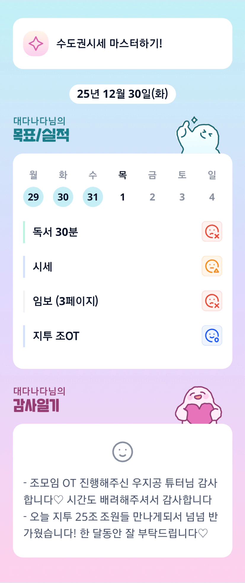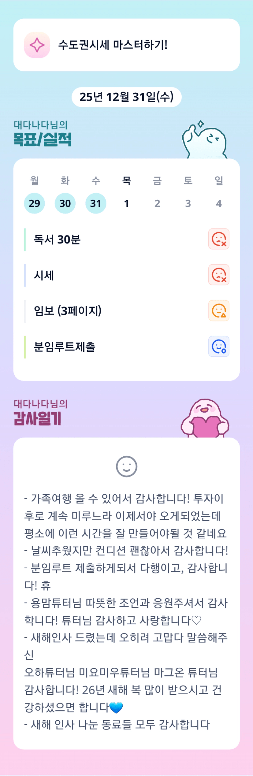 나다님 가족여행 다녀오셨구나 오랜만에 휴식이라 엄청 즐거우셨겠어요! 튜터님들께 새해인사라니 스윗나다...
