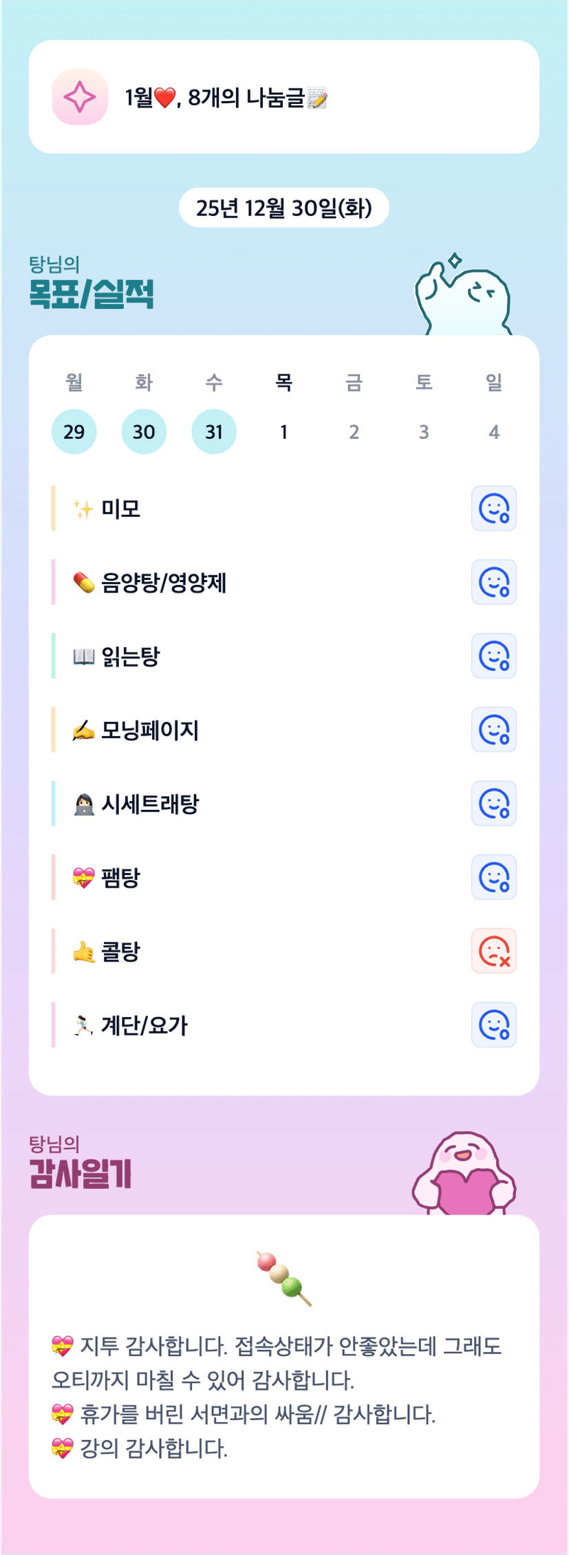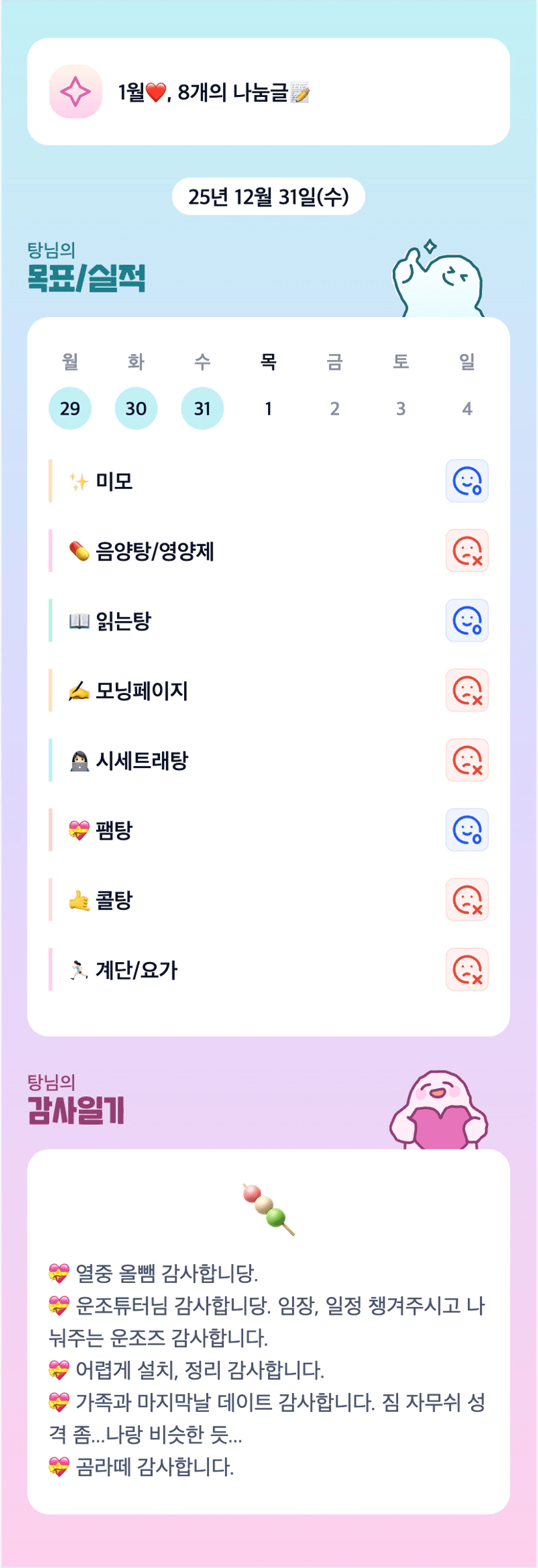 탕으로 끝나는 루틴들 너무 귀여워요..ㅎㅎㅎ 25년 마무리 고생 많으셨습니다 탕님!!
